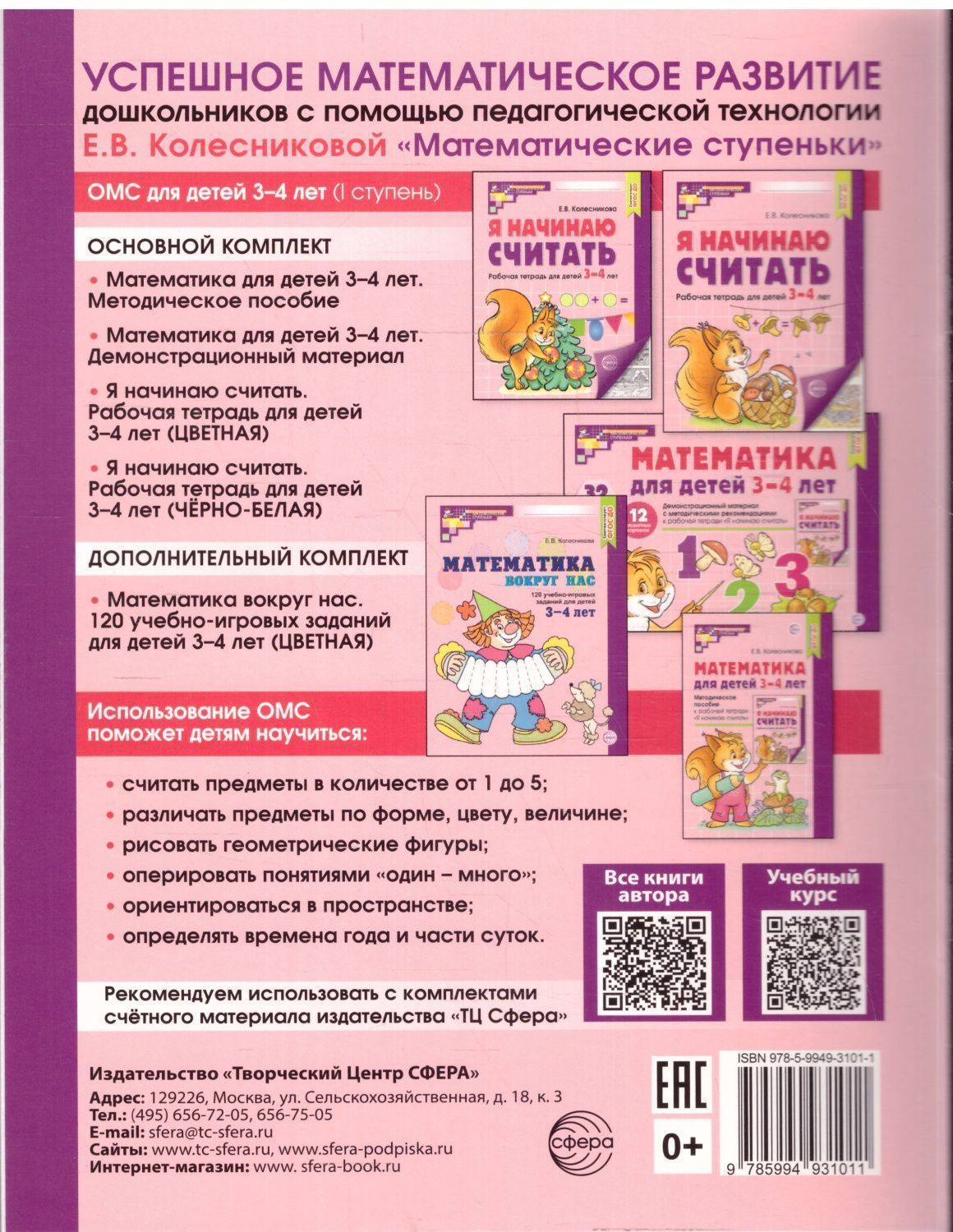 Книга «Я начинаю считать» и методическое пособие «Математика для детей 3—4 лет» входят в первую часть основного учебно-методического комплекта (УМК) парциальной образовательной программы «Математические ступеньки». Через систему увлекательных упражнений дети познакомятся с числами до 5, расширят знания о геометрических фигурах, временах года и частях суток, научатся ориентироваться в пространстве и решать логические задачи. Выполнение предложенных заданий решает одну из задач ФГОС ДО — формирование предпосылок учебной деятельности. Совместная работа со взрослым поможет ребенку подготовиться к следующему этапу обучения по тетради «Я считаю до пяти». Новые красочные рисунки превратят занятие в радостное, яркое событие. В издании учтены требования ФГОС ДО к учебно-методическим комплектам парциальных образовательных программ. Рекомендуется широкому кругу специалистов ДОО, родителям и гувернерам для подготовки детей к школе.Характеристики