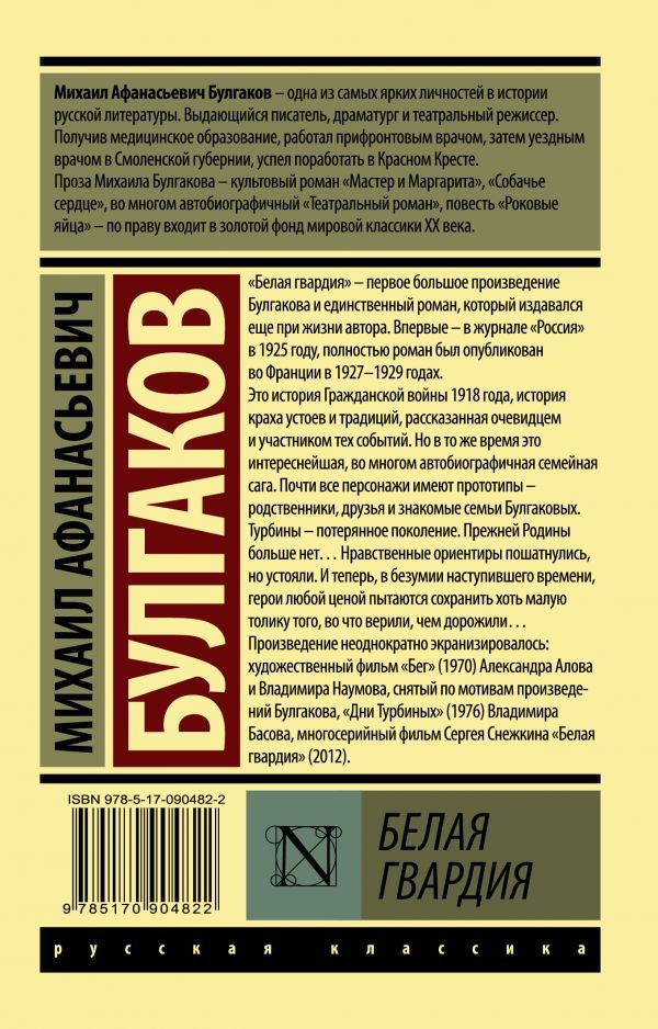 «Белая гвардия» — первое большое произведение Булгакова и единственный роман, который издавался еще при жизни автора. Впервые — в журнале «Россия» еще в 1925 году, полностью роман был опубликован во Франции в 1927-1929 годах. Это история Гражданской войны 1918 года, история краха устоев и традиций, расказанная очевидцем и участником тех событий. Но в то же время это интереснейшая, во многом автобиографичная семейная сага. Почти все персонажи имеют прототипы — родственники, друзья, знакомые семьи Булгаковых. Турбины — потерянное поколение. Прежней Родины больше нет... Нравственные ориентиры пошатнулись, но устояли. И теперь, в безумии наступившего времени, герои любой ценой пытаются сохранить хоть малую толику того, во что верили, чем дорожили. Произведение неоднократно экранизировалось: художественный фильм «Бег» (1970) Александра Алова и Владимира Наумова, снятый по мотивам произведений Булгакова, «Дни Турбиных» (1976) Владимира Басова, многосерийный фильм Сергея Снежкина «Белая гвардия» (2012).Характеристики