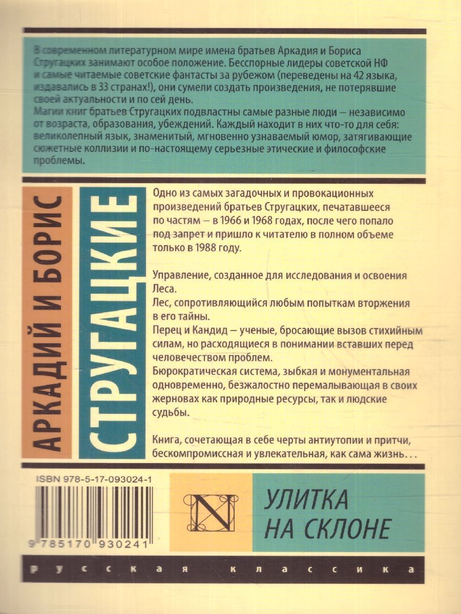 Улитка на склоне. Эксклюзив: Русская классика. Одно из самых загадочных и провокационных произведений братьев Стругацких, печатавшееся по частям – в 1966 и 1968 годах, после чего попало под запрет и пришло к читателю в полном объеме только в 1988 году. Управление, созданное для исследования и освоения Леса. Лес, сопротивляющийся любым попыткам вторжения в его тайны. Перец и Кандид – ученые, бросающие вызов стихийным силам, но расходящиеся в понимании вставших перед человечеством проблем. Бюрократическая система, зыбкая и монументальная одновременно, безжалостно перемалывающая в своих жерновах как природные ресурсы, так и людские судьбы. Книга, сочетающая в себе черты антиутопии и притчи, бескомпромиссная и увлекательная, как сама жизнь…Характеристики