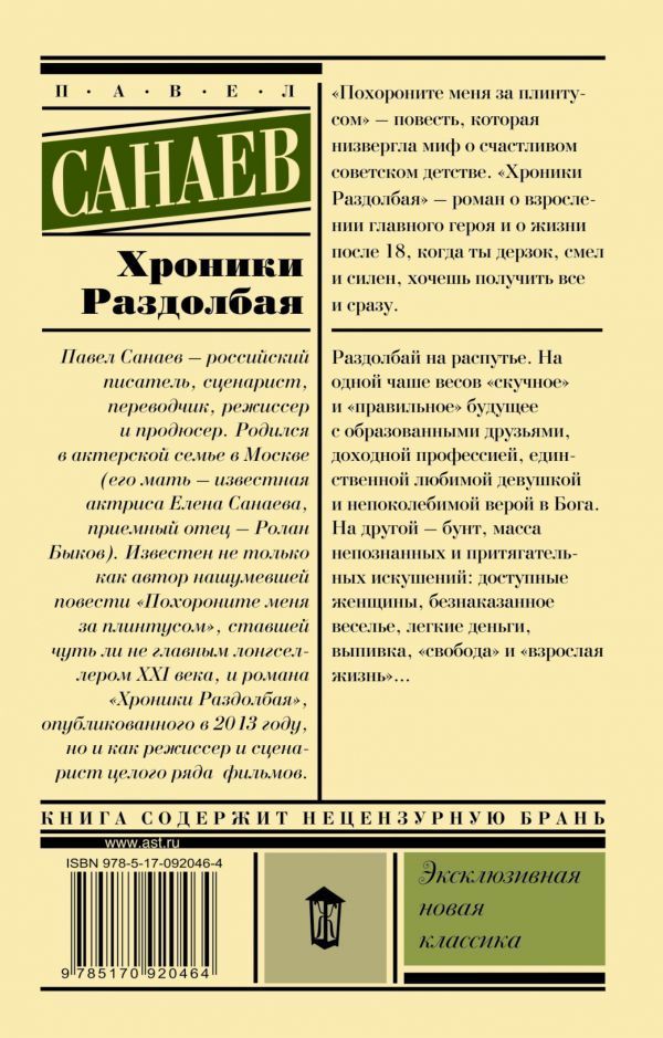 "Хроники Раздолбая" - продолжение культовой повести Павла Санаева "Похороните меня за плинтусом". Герою девятнадцать лет, и все называют его Раздолбаем. Раздираемый противоречивыми желаниями и стремлениями, то подверженный влиянию других, то отстаивающий свои убеждения, Раздолбай будет узнавать жизнь методом проб и ошибок. Проституки и секс, свобода, безнаказанность и бунт - с одной стороны; одна-единственная любимая девушка, образованные друзья и вера в Бога - с другой. Наверное самое притягательное в новом романе Павла Санаева - предельная искренность главного героя. Он поделится с нами теми мыслями и чувствами, в которых мы боимся сами себе признаться.Характеристики