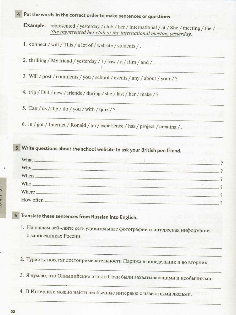 Рабочая тетрадь является составной частью учебно-методического комплекта для 6 класса. Содержание рабочей тетради тесно связано с учебным пособием и направлено на закрепление материала, изучаемого на уроках. Рабочая тетрадь содержит упражнения, предназначенные для формирования у учащихся грамматических, лексических и орфографических навыков, а также для развития умений письменной речи и чтения. Упражнения повышенной трудности отмечены звездочкой и выполняются по желанию. Рабочая тетрадь содержит также дополнительный комплект проверочных заданий (Test Yourself).Характеристики