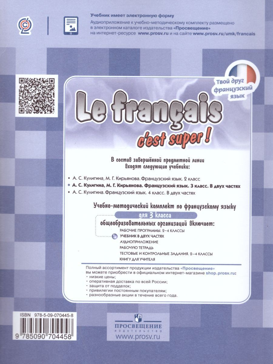 Учебник «Французский язык. 3 класс для общеобразовательных организаций. В 2-х частях» авторов А. С. Кулигиной, М. Г. Кирьяновой продолжает линию учебно-методических комплектов «Твой друг французский язык» для начальной школы и соответствует требованиям Федерального государственного образовательного стандарта начального общего образования. Учебные материалы данного курса обеспечивают достижение развивающих и образовательных целей обучения на данном этапе, дают возможность развития коммуникативно-игровых способностей учащихся, являются основой для формирования интереса к культуре Франции. В основу методической концепции положены коммуникативный подход к обучению иностранному языку, принцип социокультурного развития учащихся средствами иностранного языка, личностно-ориентированное обучение французскому языку, что соответствует современным требованиям, предъявленным к учебнику иностранного языка. В учебнике широко представлена страноведческая информация, способствующая социокультурному развитию учащихся. Она содХарактеристики