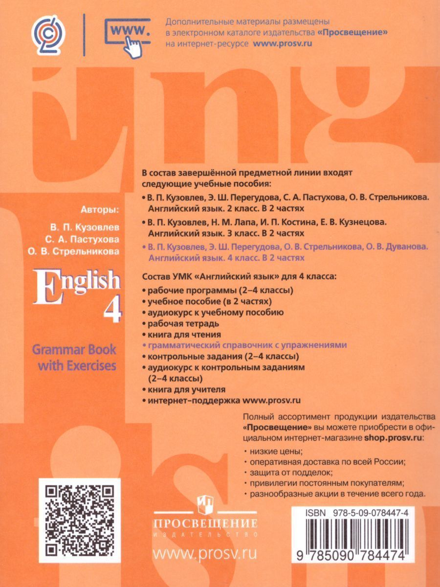 Данный грамматический справочник является одним из компонентов УМК "English 4". Справочник можно использовать как самостоятельное пособие по изучению грамматики английского языка и как дополнительное пособие в помощь родителям, желающими помочь ребёнку в более глубоком усвоении основ грамматики английского языка. Пособие рассчитано на более глубокое и системное изучение грамматики английского языка в начальной школе. Оно включает в себя грамматические правила с иллюстрациями и примерами, разнообразные виды упражнений, обеспечивающие пошаговое овладение материалом, и задания для самоконтроля.Характеристики