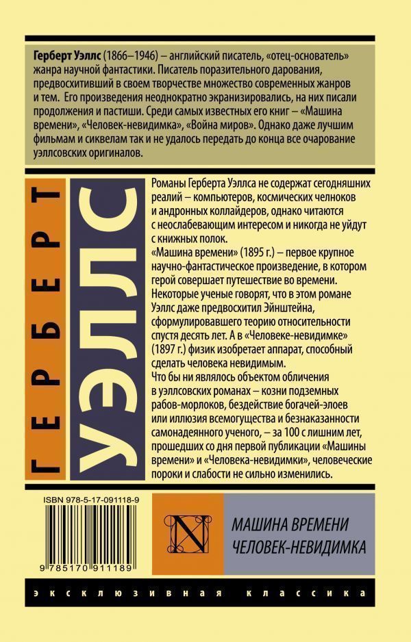 В сборник вошли два популярных научно‑фантастических романа мастера жанра Герберта Уэллса. Опубликованные с разницей в два года, оба они имели ошеломительный успех сразу после выхода. Сюжет «Машины времени» разворачивается на Земле в далеком будущем, куда главный герой попадает с помощью собственноручно сконструированного механизма. Он ожидает увидеть высокоразвитое общество, но встречает лишь деградировавших людей. Разочарованный, он отправляется еще дальше. И не обнаруживает ни одного разумного существа... В «Человеке‑невидимке» описывается жизнь выдающегося ученого, который изобрел уникальный аппарат, способный делать невидимым все что угодно. В погоне за славой, еще даже не успев никому объяснить секрет успеха, он и сам решает стать незаметным...Характеристики