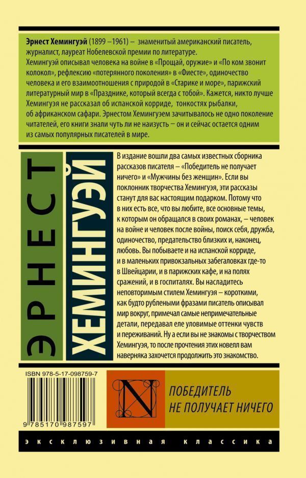 Эрнест Хемингуэй (1899 – 1961) – знаменитый американский писатель, журналист, лауреат Нобелевской премии по литературе. Хэмингуэй описывал человека на войне в "Прощай, оружие!" и "По ком звонит колокол", рефлексию "потерянного поколения" в "Фиесте", одиночество человека и его взаимоотношения с природой в "Старике и море", парижский литературный мир в "Празднике, который всегда с тобой". Кажется, никто лучше Хемингуэя не рассказал об испанской корриде, тонкостях рыбалки и африканском сафари. Эрнестом Хэмингуэем зачитывалось не одно поколение читателей, его книги знали чуть ли не наизусть – он и сейчас остается одним из самых популярных писателей в мире. В издание вошли два самых известных сборника рассказов писателя – "Победитель не получает ничего" и "Мужчины без женщин". Если вы поклонник творчества Хемингуэя, эти рассказы станут для вас настоящим подарком. Потому что в них есть все, что вы любите – все основные темы, к которым он обращался в своих романах – человек на войне и человек после войны, поиск себя, дружба, одиночество, предательство близких, и, наконец, любовь. Вы побываете и на испанской корриде, и в маленьких привокзальных забегаловках где-то в Швейцарии, и в парижских кафе, и на полях сражений, и в госпиталях. Вы насладитесь неповторимым стилем Хемингуэя – короткими, как будто рублеными фразами писатель описывал мир вокруг, примечал самые непримечательные детали, передавал еле уловимые оттенки чувств и переживаний. Ну а если вы не знакомы с творчеством Хемингуэя, то после прочтения этих новелл вам наверняка захочется продолжить это знакомство.Характеристики