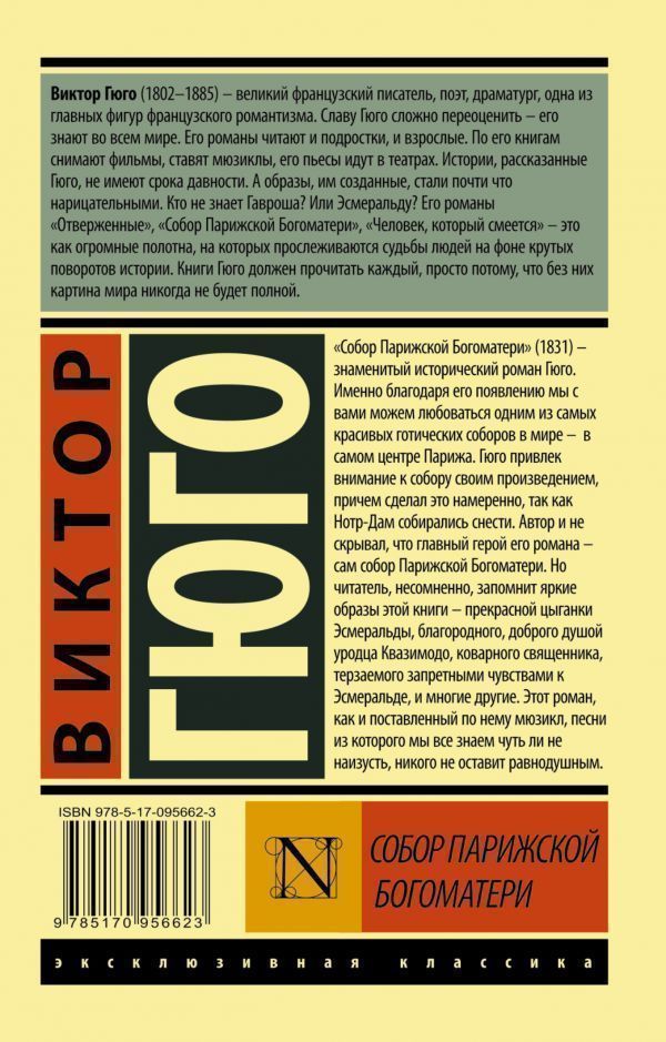 "Собор Парижской Богоматери" (1831) — знаменитый исторический роман Гюго. Именно благодаря его появлению мы с вами можем любоваться одним из самых красивых готических соборов в мире — в самом центре Парижа. Гюго привлек внимание к собору своим произведением, причем сделал это намеренно, так как Нотр-Дам собирались снести. Автор и не скрывал, что главный герой его романа — сам собор Парижской Богоматери. Но читатель, несомненно, запомнит яркие образы этой книги — прекрасной цыганки Эсмеральды, благородного, доброго душой уродца Квазимодо, коварного священника, терзаемого запретными чувствами к Эсмеральде, и многие другие. Этот роман, как и поставленный по нему мюзикл, песни из которого мы все знаем чуть ли не наизусть, никого не оставит равнодушным.Характеристики