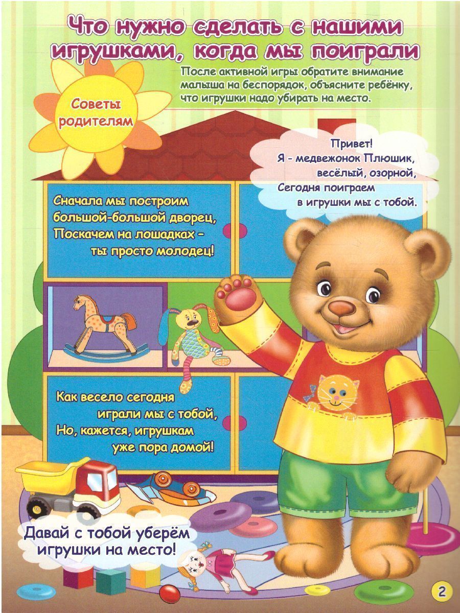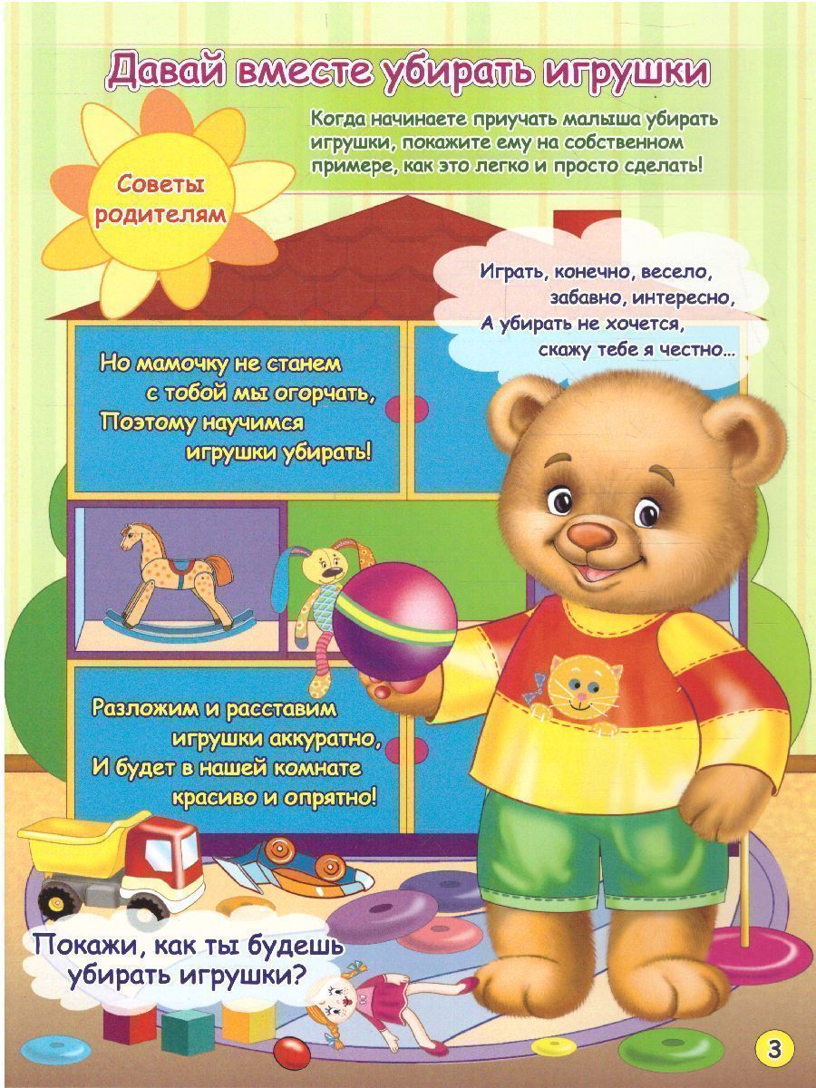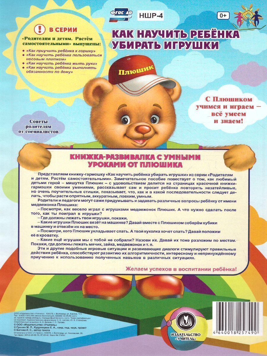 Представляем книжку-гармошку "Как научить ребенка убирать игрушки" из серии "Родителям и детям. Растем самостоятельными". Замечательное пособие повествует о том, как любимый детьми герой - мишутка Плюшик - с удовольствием делится на страницах красочной книжки-гармошки своими умениями, рассказывает сам и просит ребенка повторить незатейливые, но очень поучительные стишки, показывает, что, как и в какой последовательности следует делать, чтобы расти опрятным, аккуратным, ловким, умным. Родители и педагоги могут сами придумывать и задавать различные вопросы ребенку от имени медвежонка Плюшика: - Посмотри, как весело играл с игрушками медвежонок Плюшик. А что нужно сделать после того, как ты поиграл в игрушки? - Где должны лежать твои игрушки, покажи. - Какие игрушки Плюшик везёт на машинке? Давай вместе с Плюшиком соберём кубики в машинку и отвезём их на место. - Посмотри, кого Плюшик укладывает спать? А твоя куколка хочет спать? Давай положим её в кроватку. - Какие ещё игрушки мы с тобой не собрали? Назови их.Характеристики