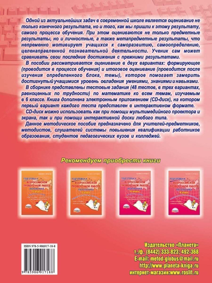 В сборнике представлены тестовые задания по математике ко всем параграфам учебника «Математика. 6 класс» С.М. Никольского. Пособие содержит 56 тестов (в трех вариантах, равноценных по трудности). Книга дополнена электронным приложением (CD-диск), на котором первый вариант каждого теста представлен в интерактивном формате. CD-диск можно использовать как при помощи мультимедийного проектора и экрана, так и при помощи интерактивной доски любого типа. Данное методическое пособие предназначено для учителей предметников, методистов, слушателей системы повышения квалификации работников образования, студентов педагогических вузов и колледжей.Характеристики