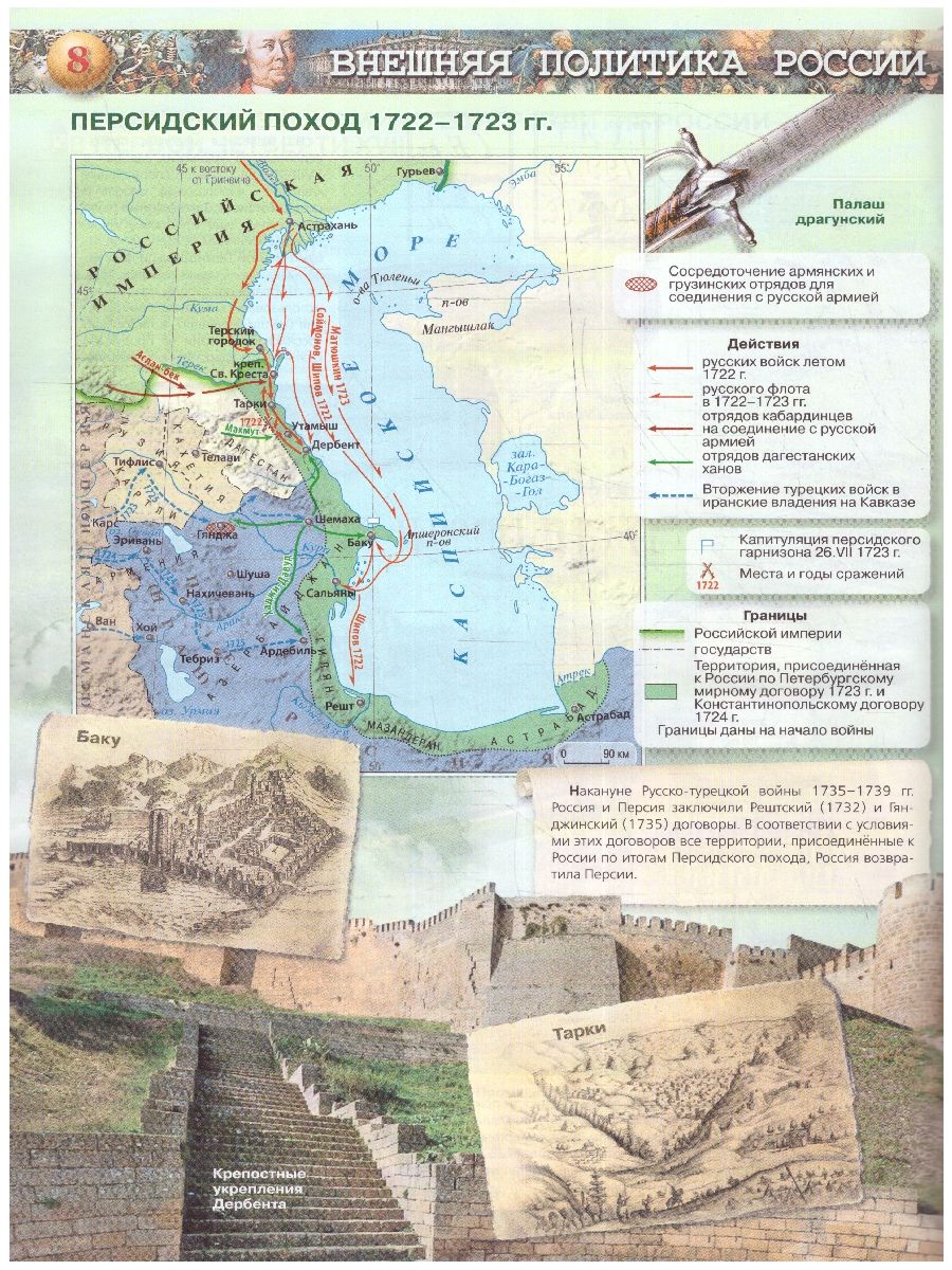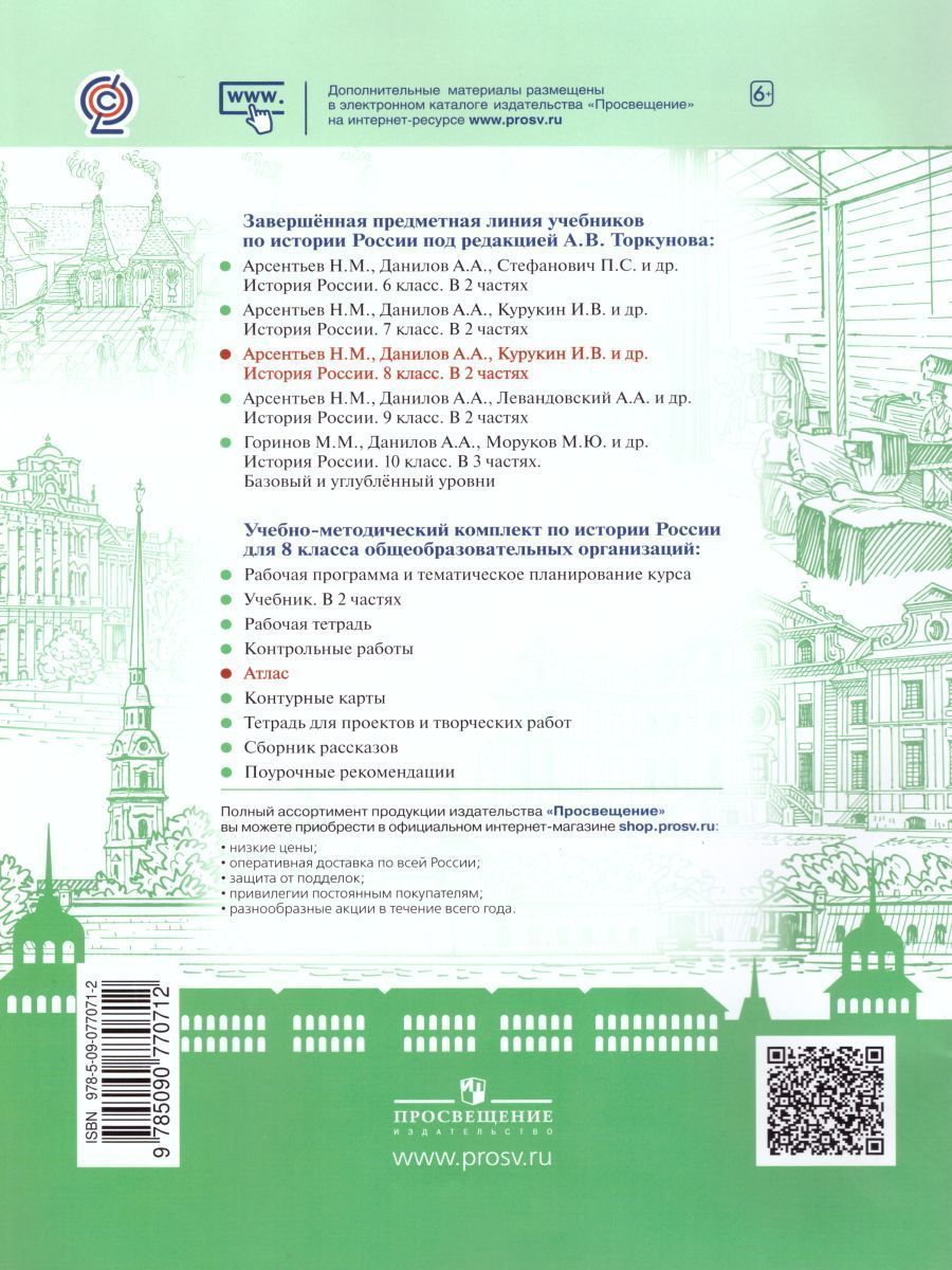 Линия УМК под ред. А.В. Торкунова (6-10) Атлас является составной частью учебно-методического комплекта «История России. 8 класс» (авторы учебника Н.М. Арсентьев, А.А. Данилов, И.В. Курукин, А.Я. Токарева) и представляет собой современное учебное иллюстрированное картографическое издание. Каждый тематический разворот атласа содержит комплекс взаимосвязанных информационно-методических материалов (основные и дополнительные карты, объёмные схемы, иллюстрации и пр.), освещающих одну тему и обеспечивающих комплексный подход к подаче информации. Атлас может быть использован с любым из действующих учебников по истории для 8 класса.Характеристики