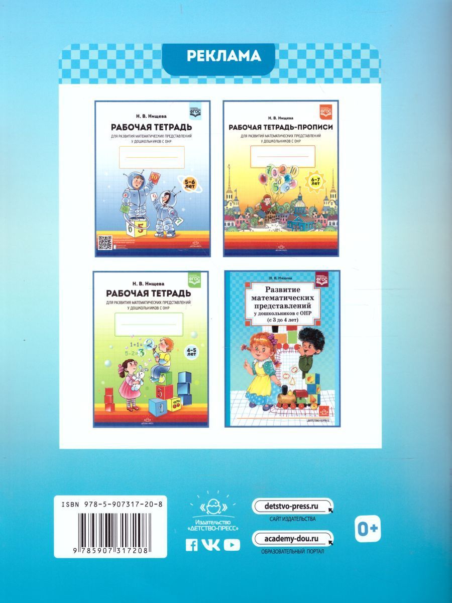 Пособие "Развитие математических представлений у дошкольников с ОНР (с 3 до 4 лет)" входит в методический комплект к "Программе коррекционно-развивающей работы в младшей логопедической группе детского сада" Н.В.Нищевой, рассмотренной Северо-Западным региональным экспертным советом министерства образования Российской Федерации и рекомендованной к использованию в дошкольных образовательных учреждениях Комитетом по образованию правительства Санкт-Петербурга..В пособии представлены конспекты занятий воспитателя по развитию математических представлений у дошкольников четвертого года жизни и картотека игр на весь учебный год..К пособию выпущена "Рабочая тетрадь для развития математических представлений у дошкольников с ОНР (с 3 до 4 лет)".Характеристики