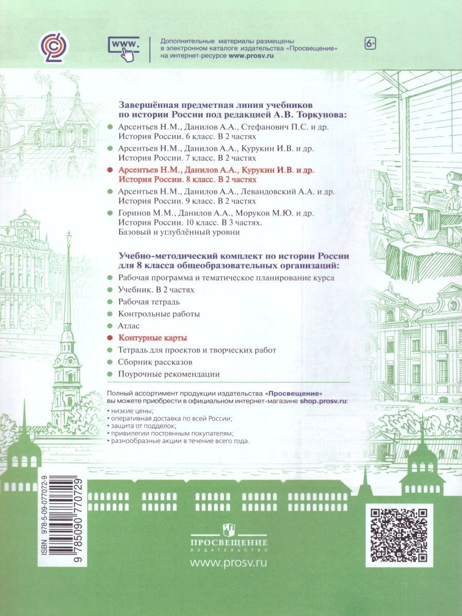 Линия УМК «Под редакцией А.В. Торкунова (6-10 классы)» Контурные карты являются составной частью учебно-методического комплекта «История России. 8 класс» (авторы учебника Н.М. Арсентьев, А.А. Данилов, И.В. Курукин, А.Я. Токарева) и представляют собой современное учебное картографическое издание. Цветные контурные карты выполнены в технике объёмного изображения рельефа. К каждой карте предлагается система заданий разных типов и уровней сложности, ориентированных как на закрепление основных исторических знаний и формирование базовых навыков, так и на развитие аналитических способностей школьников. Контурные карты могут быть использованы с любым из действующих учебников по истории для 8 класса.Характеристики