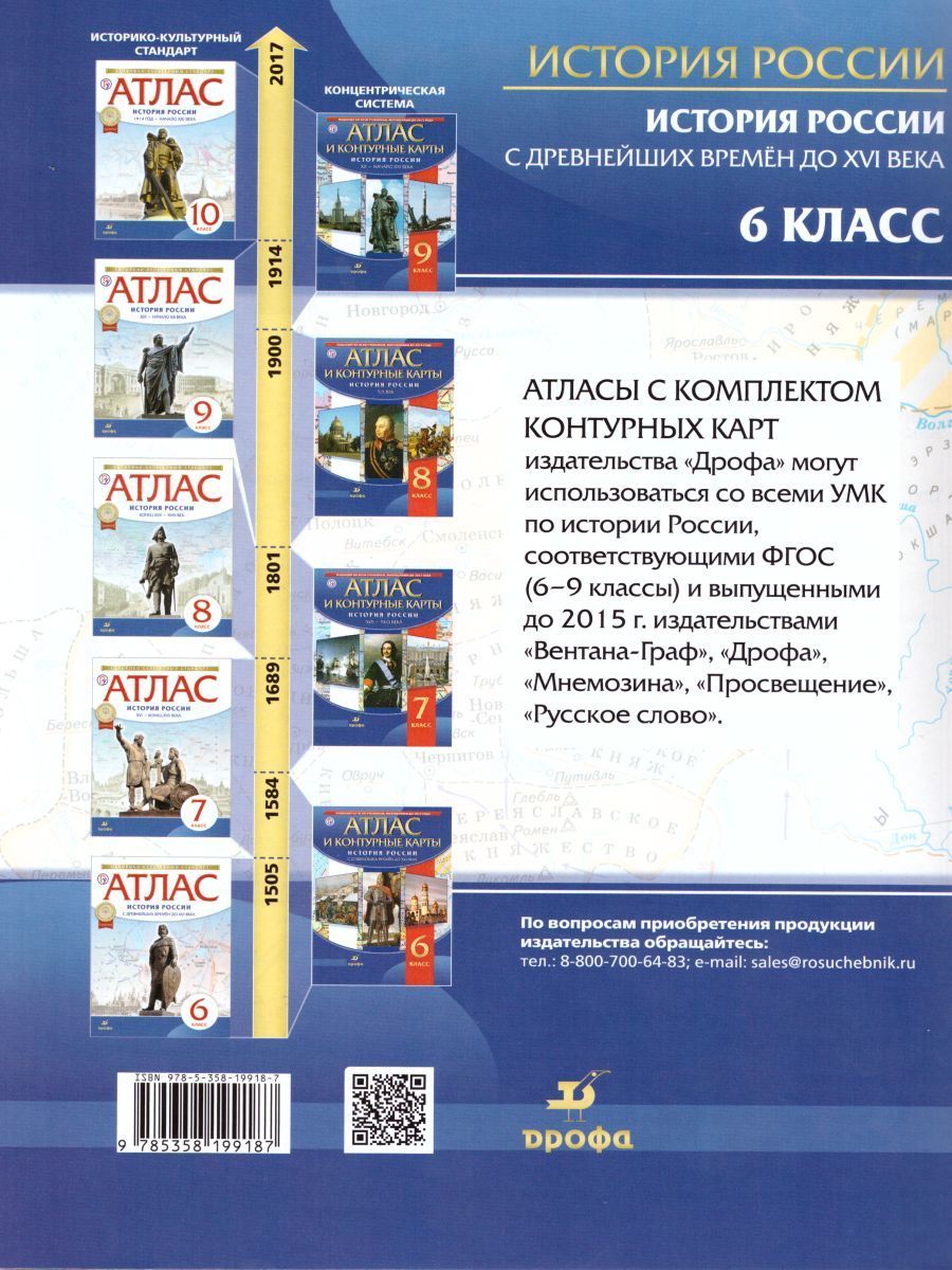История России с древнейших времён до XVI в. Атлас с контурными картами для 6 класса. Атласы с комплектом контурных карт издательства "Дрофа" могут использоваться со всеми УМК по истории России, соответствующими ФГОС (6-9 классы) и выпущенными до 2015 г. издательствами "Вентана-Граф", "Дрофа", "Мнемозина", "Просвещение", "Русское слово".Характеристики
