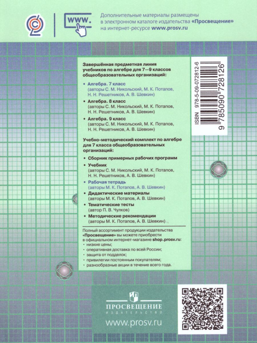 Рабочая тетрадь является частью учебно-методического комплекта к учебнику «Алгебра. 7 класс» С. М. Никольского и др. Задания из рабочей тетради можно использовать на первоначальном этапе изучения и закрепления нового материала. Каждый пункт рабочей тетради имеет тот же номер и то же название, что соответствующий пункт учебника. В первую часть рабочей тетради вошёл материал к первым шести параграфам учебника. В большинстве пунктов тетради приведены краткие теоретические сведения, которые помогут в работе не только в течение учебного года, но и при повторении материала летом, когда у учащихся нет под рукой учебника. Наличие образцов выполнения заданий, частично выполненных записей вычислений, преобразований, задания на установление соответствия, на подчёркивание и т. п. — всё это позволит повысить темп урока, увеличить число выполняемых на уроке заданий. Рабочая тетрадь содержит некоторые текстовые задачи по программе 5—6 классов, решаемые арифметическими способами. Это — материал для повторения. В тетрадь включены также задания, нацеленные на подготовку к итоговой аттестации.Характеристики