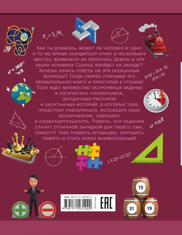 Как ты думаешь, может ли человек в одно и то же время находиться сразу в нескольких местах, возможно ли перегнать Землю и при каких условиях Солнце взойдет на западе? Хочешь узнать ответы на эти необычные вопросы? Тогда скорее открывай эту увлекательную книгу и приступай к чтению! Тебя ждет множество остроумных задачек и логических головоломок, загадочных рисунков и запутанных историй, в которых тебе предстоит разобраться, используя свое воображение, смекалку и сообразительность. Поверь, эти задания станут отличной зарядкой для твоего ума, помогут тебе развить эрудицию, улучшить память и стать более внимательным!Характеристики