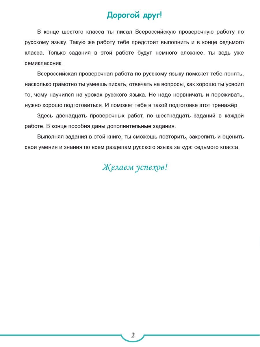Пособие содержит задания по русскому языку для обучающихся 7 класса и предназначено для подготовки семиклассников к написанию Всероссийской проверочной работы по русскому языку. Книга может использоваться для проведения тренировочных проверочных работ по русскому языку, а также как индивидуальный (домашний) тренажёр для учеников 7 класса. Для учителей выпущено методическое пособие, в котором для каждой работы даны: спецификация, рекомендации и инструкция по проверке и оценке заданий. Данная книга предназначена учащимся 7 класса, родителям, учителям русского языка и литературы образовательных организаций, методистам, слушателям курсов повышения квалификации работников образования.Характеристики