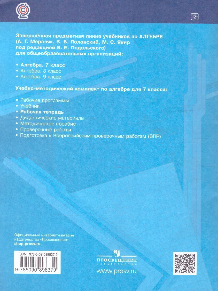 Рабочая тетрадь содержит различные виды заданий на усвоение и закрепление нового материала, задания развивающего характера, дополнительные задания, которые позволяют проводить дифференцированное обучение. Тетрадь используется в комплекте с учебником "Алгебра. 7 класс" (авт. А.Г. Мерзляк, В.Б. Полонский, М.С. Якир), входящим в систему "Алгоритм успеха". Соответствует Федеральному государственному образовательному стандарту основного общего образования.Характеристики