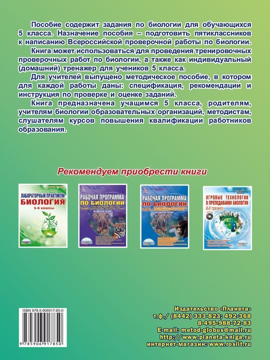 Пособие содержит задания по биологии для обучающихся 5 класса. Назначение пособия – подготовить пятиклассников к написанию Всероссийской проверочной работы по биологии. Книга может использоваться для проведения тренировочных проверочных работ по биологии, а также как индивидуальный (домашний) тренажер для учеников 5 класса. Для учителей выпущено методическое пособие, в котором для каждой работы даны: спецификация, рекомендации и инструкция по проверке и оценке заданий. Книга предназначена учащимся 5 класса, родителям, учителям биологии образовательных организаций, методистам, слушателям курсов повышения квалификации работников образования.Характеристики