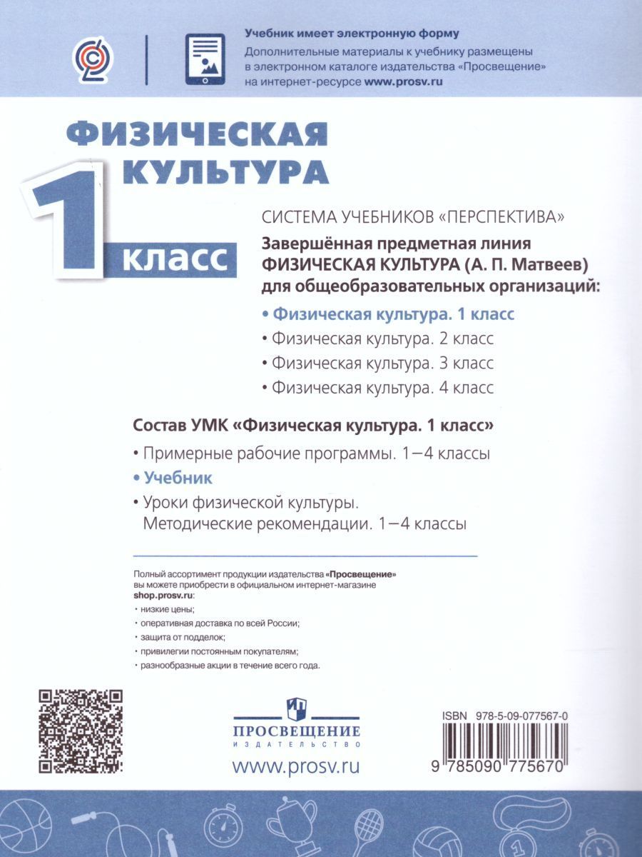Учебник поможет первоклассникам на основе обширного иллюстративного материала и доступного текста усвоить научиться самостоятельно составлять режим дня, делать зарядку, упражнения для улучшения осанки, проводить физкультминутки, подвижные игры. Практические задания помогут учащимся развивать мышление и самостоятельность, развивать силу быстроту, выносливость, координацию. Учащимся предлагается регулярно вести дневник самонаблюдения, в который следует заносить изменения показателей телосложения и физического развития. Материал учебника разработан в соответствии с тематическим планированием примерной рабочей программы А. П. Матвеева "Физическая культура. 1—4 классы".Характеристики
