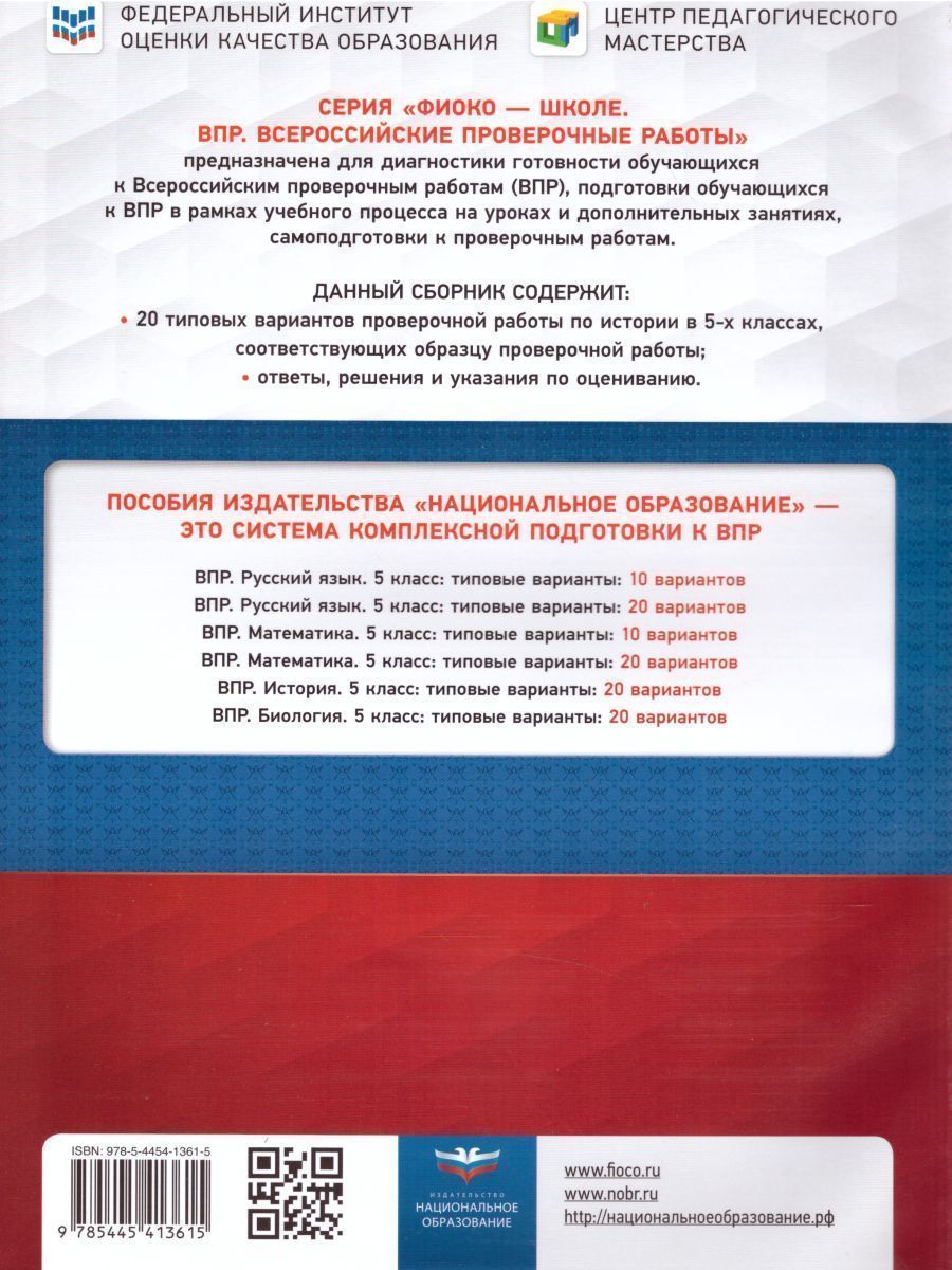 Серия «ВПР. Всероссийские проверочные работы» подготовлена разработчиками вариантов для проведения Всероссийских проверочных работ. В сборнике представлены: • 20 типовых вариантов проверочной работы по истории в 5-х классах, составленных в соответствии с образцом проверочной работы; • инструкция по выполнению работы; • ответы и указания по оцениванию; • карта индивидуальных достижений, фиксирующая результаты выполнения всех вариантов проверочной работы. Ответы и указания по оцениванию выполнения заданий представлены в отдельной брошюре, вложенной в сборник. Выполнение типовых вариантов предоставляет обучающимся возможность самостоятельно подготовиться к Всероссийским проверочным работам и объективно оценить уровень своей подготовки. Учителя могут использовать издания серии для организации кон�... Рекомендуем!Характеристики