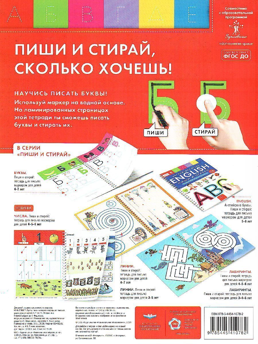 Учиться писать буквы - очень увлекательное занятие. Попробуйте сами: напишите маркером букву в этой тетради, сначала по стрелочкам, затем самостоятельно. Хорошо получилось? Все красивые буквы оставляйте, а остальные просто стирайте. Благодаря картинкам, пунктирным буквам и прочим подсказкам ваш ребенок прекрасно справится с этой задачей. Незаметно для себя он напишет каждую букву много раз и доведет ее почти до совершенства. На ламинированных страницах этой тетради можно писать маркерами и фломастерами. Они чисто стираются ватным диском или влажной салфеткой. Поэтому писать и стирать в тетради можно столько, сколько захочется! Для детей старшего дошкольного возраста. Рекомендуем!Характеристики