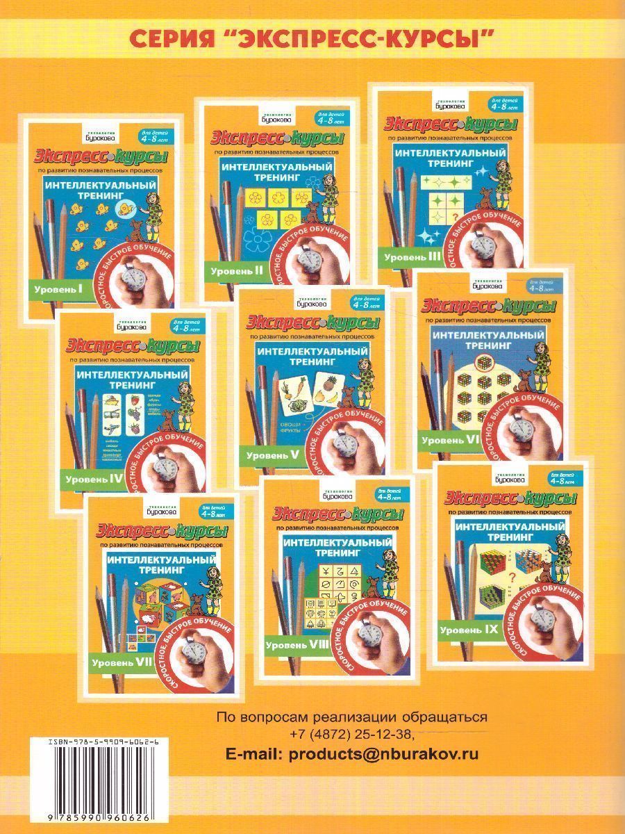 Экспресс-курсы «Интеллектуальный тренинг. 9 часть»- это четкая и продуманная система заданий на развитие познавательных процессов: восприятия, внимания, мышления, пямяти и воображения. Увлекательные упражнения не дадут ребенку скучать. Задания даются по принципу "от простого к сложному" Старайтесь проводить занятия регулярно и приблизительно в одно и то же время. Задания выполняйте простым карандашом, чтобы в случае ошибки просто стереть ненужную линию. Раскрашивание картинок в рабочей тетради, не только развлечет ребенка, но и поможет в развитии тонкой моторики и координации движений. Пособие предназначено родителям, учителям, воспитателям, логопедамХарактеристики