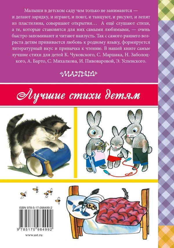 В книгу "Стихи для чтения в детском саду" вошли произведения классиков детской литературы - К. Чуковского, Н. Заболоцкого, С. Маршака, С. Михалкова, И. Пивоваровой, А. Барто, Э. Успенского и других. Сихи подобраны для детей дошкольного возраста - небольшие по объёму, чёткие по ритму, образные и легко запоминающиеся. Иллюстрации лучших художников - Э. Булатова и О. Васильева, О. Зотова, А. Савченко, С. Бялковской и других. Для дошкольного возраста.Характеристики