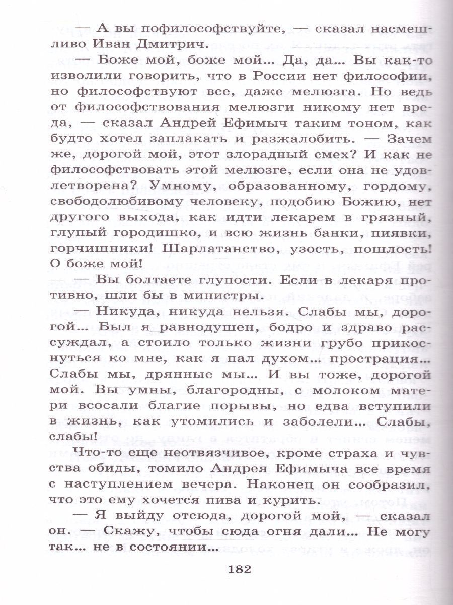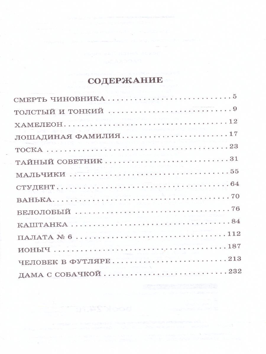 В книгу вошли самые известные рассказы А.П. Чехова: "Каштанка", "Хамелеон", "Ванька", "Человек в футляре", "Палата № 6", "Дама с собачкой" и другие, изучение которых предусмотрено школьной программой. Рассказы Чехова коротки, но за видимой простотой в них скрыты глубина смысла и сложность художественного построения. Лаконичность, потрясающий юмор, ирония и богатое содержание делают их уникальными и не имеющими аналогов в мировой литературе. Максим Горький писал: "Никто не понимал так ясно и тонко, как Антон Чехов, трагизм мелочей жизни, никто до него не умел так беспощадно правдиво нарисовать людям позорную и тоскливую картину их жизни в тусклом хаосе мещанской обыденщины".Характеристики