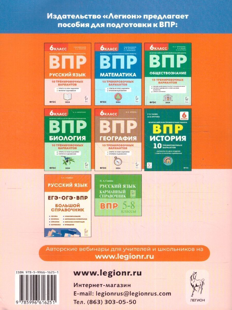 Пособие содержит 15 вариантов работ по русскому языку для 6-го класса в формате ВПР, написанных автором в полном соответствии с описанием и образцом всероссийской проверочной работы. Наша книга поможет * учителям подробно ознакомиться с моделью проверочной работы, её описанием и системой оценивания: каждый вариант содержит ответы, а один из них - методические указания к оцениванию; * шестиклассникам ознакомиться с образцом работы, имеющим подробный комментарий, а также в кратчайшие сроки повторить и систематизировать пройденный материал, что позволит качественно подготовиться к проверочной работе, которая их ожидает весной 2019 года; * родителям проконтролировать процесс подготовки их детей к серьёзному испытанию. Второе издание дополнено новыми вариантами, один из которых содержит комментарий к каждому заданию, теорией, схемами и образцами всех видов разборов. Пособие предназначено учителям, учащимся 6-х классов и их родителям. В 7-х классах книгу можно использовать в начале учебного года в качестве диагностХарактеристики