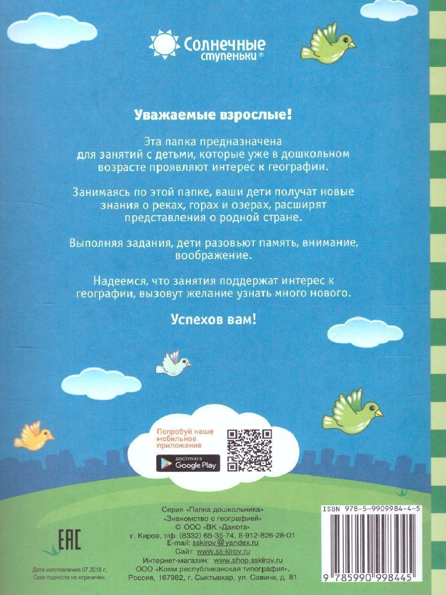 Эта папка предназначена для занятий с детьми, которые уже в дошкольном возрасте проявляют интерес к географии. Занимаясь по этой папке, ваши дети получат новые знания о реках, горах и озерах, расширят представления о родной стране. Выполняя задания, дети разовьют память, внимание, воображение. Надеемся, что занятия поддержат интерес к географии, вызовут желание узнать много нового.Характеристики