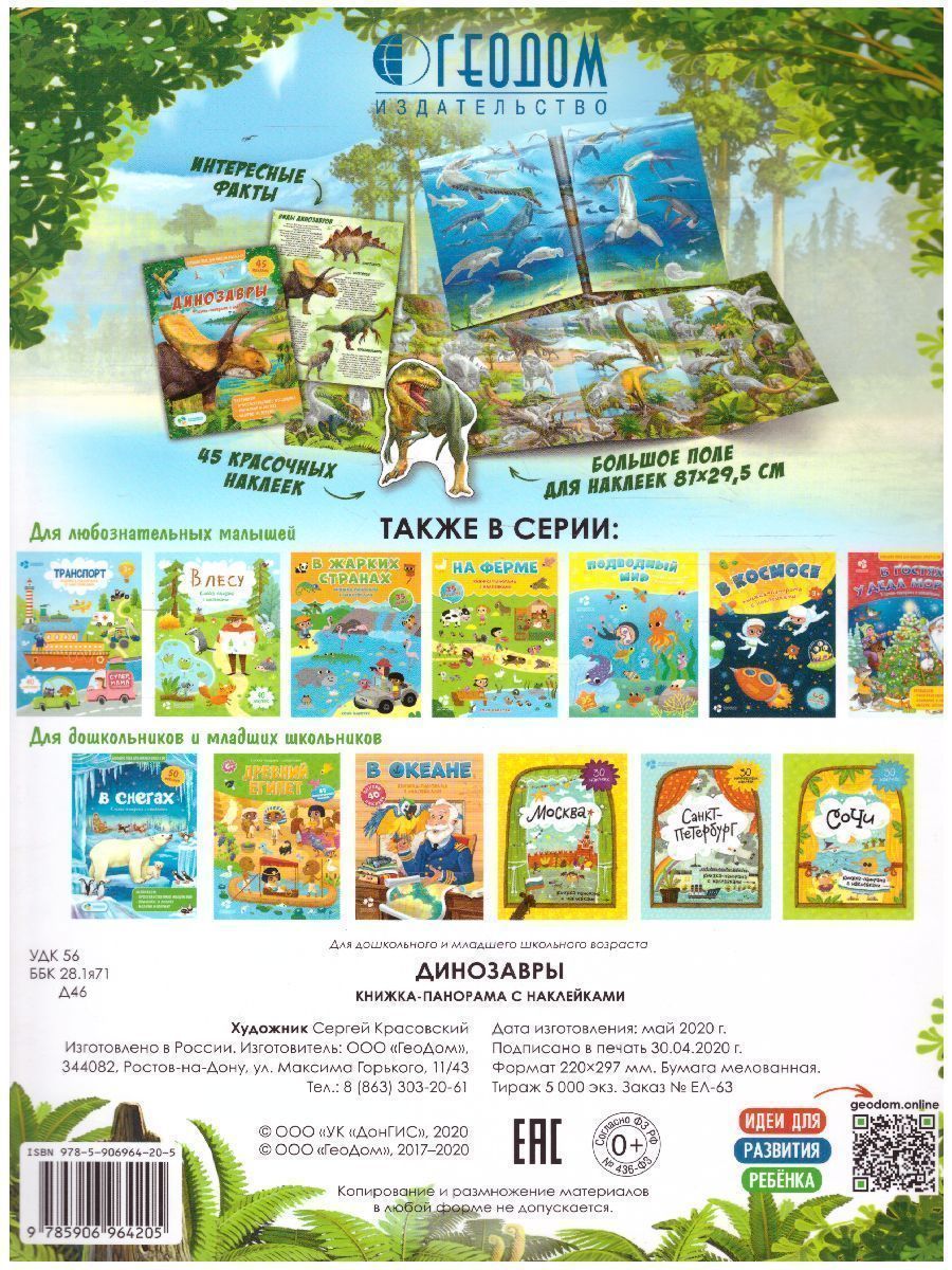 Книжка-панорама с наклейками "Динозавры" – это увлекательное путешествие во времена Юрского периода! Издание таит в себе множество интересного: позволяет с лёгкостью изучить названия видов динозавров, как они выглядят и какие из них маленькие и рогатые, а какие высокие и опасные. И, только представьте, что самые страшные динозавры – это наклейки, которые детки могут самостоятельно наклеить на панорамку, учитывая места их обитания. Формат: 217х297 мм. Формат в открытом виде: 870х297 мм.Характеристики