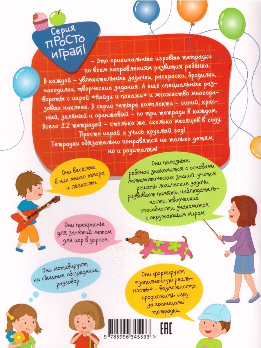 Серия "Просто играй" - это комплекты тетрадок по всем направлениям развития ребенка. В каждой - увлекательные задачки, раскраски, бродилки, находилки, творческие задания. Приятный бонус - специальные развороты с игрой "Найди и покажи", а также множество многоразовых наклеек. Всего в серии четыре комплекта - синий, красный, зелёный и оранжевый - по три тетради в каждом. Всего 12 тетрадей - столько же, сколько месяцев в году. Просто играй и учись круглый год! Лайфхаки для родителей: в игре ребенок знакомится с основами математических знаний, учится решать логические задачи, развивает память, наблюдательность, творческие способности, тетради знакомят с окружающим миром, формируют коммуникативные навыки. В каждой тетрадке существует "дополненная реальность" - возможность продолжить игру за границами тетрадки. Тетради мотивируют на общение, обсуждение, разговор. В них много юмора и легкости. Они прекрасны для занятий летом, для игр в дороге. Первые тетрадки серии посвящены математике и миру детских праздников, прогулок, досуга, знакомства с природой. Серия "Просто играй!" - это 12 тетрадей с увлекательными задачками, головоломками, бродилками, раскрасками и другими творческими заданиями. Они эффективно и в игровой форме решают задачу развития ребёнка по всем направлениям: познавательны, развивают речь и творческие способности, учат общаться и даже приглашают заняться спортом. Они прекрасны для занятий и зимой, и летом, в детском саду и дома, удобны для игр в дороге, мотивируют на общение, обсуждение, разговор.Характеристики