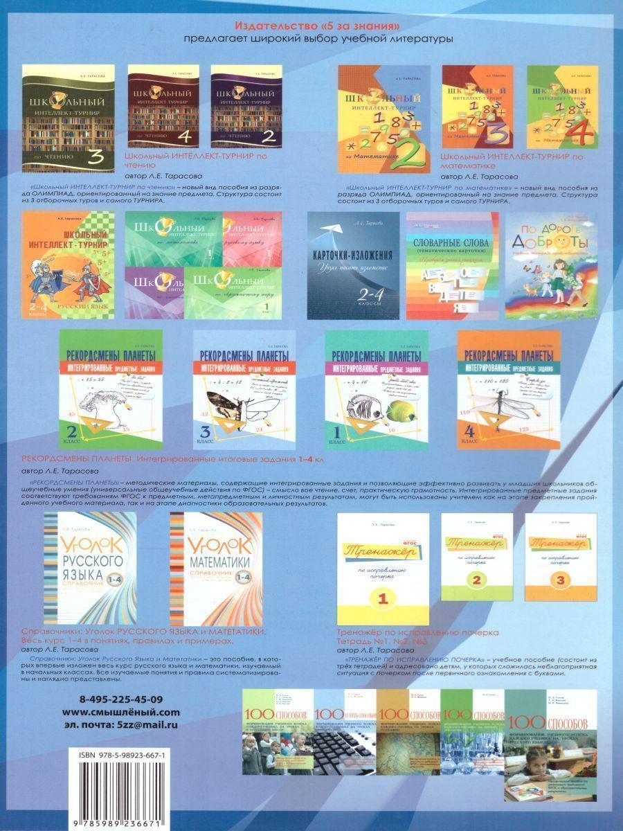 "МИНИ-ДИКТАНТЫ" - новый вид учебного пособия. Оно адресовано учителям и родителям учащихся начальной школы. "МИНИ-ДИКТАНТЫ" построены так, что с помощью них можно быстро повторить забытые темы, поскольку в одно предложение мы постарались собрать как можно больше слов на повторяемый материал. В "МИНИ-ДИКТАНТАХ" два раздела: одно предложение и два предложения. В колонке с правой стороны можно сразу отмечать использованные предложения, чтобы их в последующем не повторять или отмечать количество раз использованного материала. На каждой странице есть орфографическая пятиминутка, которая тоже может быть использована в качестве тренировочного или контрольного материала. Словарный диктант внизу содержит слова и словосочетания, которые можно использовать целиком или выбирать по своему усмотрению. Трудные для написания слова, которые входят в предложения, необходимо диктовать по слогам. "МИНИ-ДИКТАНТЫ" удобны для использования учителем на уроке. Оставшееся свободное время на уроке может быть разумно потрачено с целью повторения какого-либо пробела, выявленного у класса, или давно забытого материала. "МИНИ-ДИКТАНТЫ" соответствуют новым стандартам начального обучения второго поколения. Темы ориентированы на разные виды учебников и программ.Характеристики