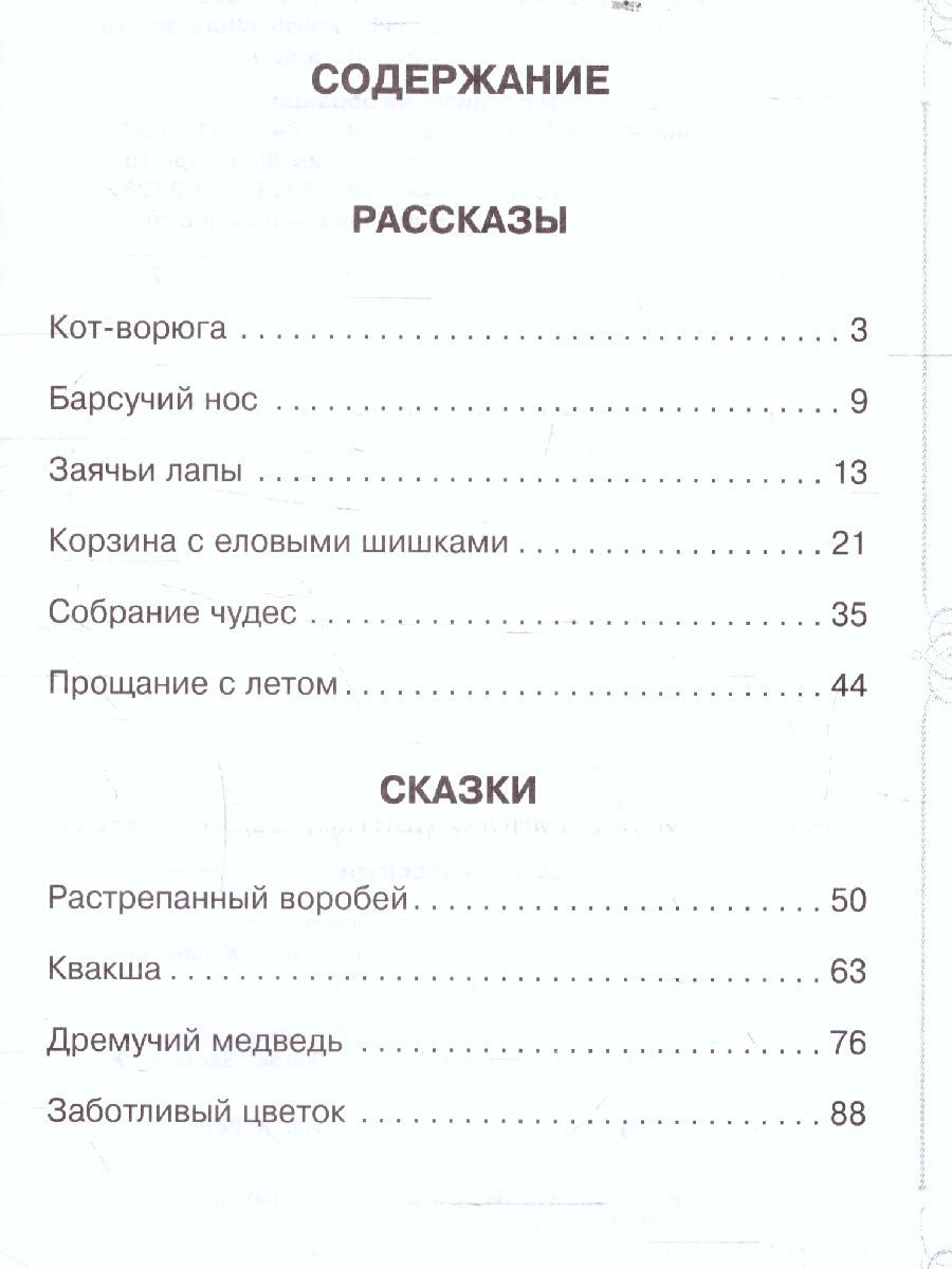 В книгу вошли рассказы о животных ("Кот-ворюга", "Барсучий нос", "Заячьи лапы", "Корзина с еловыми шишками", "Собрание чудес", "Прощание с летом") и сказки ("Растрепанный воробей", "Квакша", "Дремучий медведь", "Заботливый цветок"). Короткие произведения учат детей наблюдательности и любви к природе. Адресована младшим школьникам.Характеристики