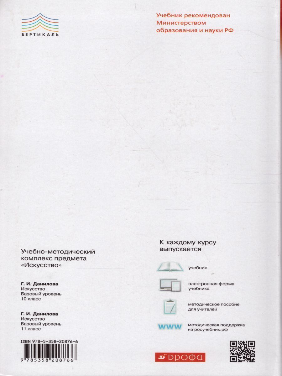 Учебник входит в учебно-методический комплекс по искусству для 11 класса (базовый уровень). Соответствует Федеральному государственному образовательному стандарту среднего (полного) общего образования, включён в Федеральный перечень. .В учебнике представлена широкая панорама развития искусства от XVII века до современности. Издание хорошо иллюстрировано. Методический аппарат содержит много интересных вопросов и творческих заданий, которые помогут закрепить и обобщить прочитанное, к каждой главе приводится список дополнительной литературы и интернет-ресурсы.Характеристики