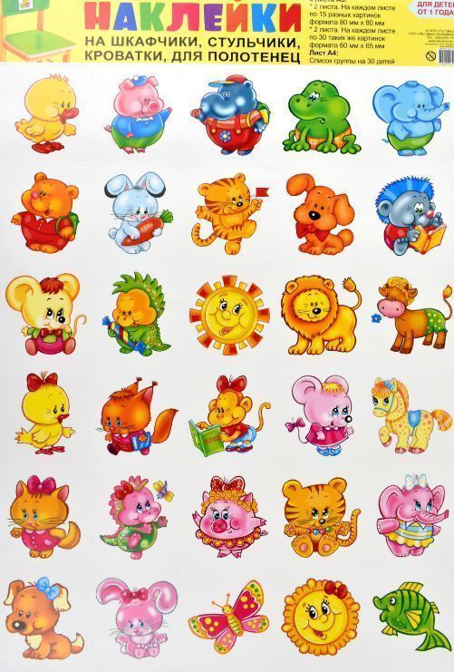 Наклейки на шкафчики, кроватки и стульчики и поощрения №2 (для детей от 1 года). В комплекте 4 листа А3 + вкладка А4 "Список детей" на 30 человек