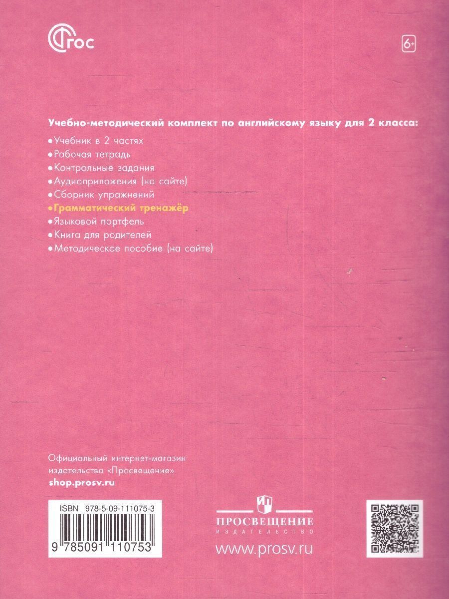 Грамматический тренажер является дополнительным компонентом УМК серии «Английский в фокусе» и предназначен для учащихся 2 класса общеобразовательных организаций. Пособие содержит разнообразные упражнения к каждому модулю учебника и рассчитано на более глубокое и системное изучение грамматики английского языка в начальной школе. Тренажер состоит из восьми модулей, тематически соответствующих модулям учебника, и включает краткую грамматическую справку в виде таблиц и простых графиков. В сборнике представлены упражнения разнообразных видов по трем видам речевой деятельности (письмо, чтение, говорение), а также творческие задания. Ключи к упражнениям пособия представлены на сайте издательства.Характеристики