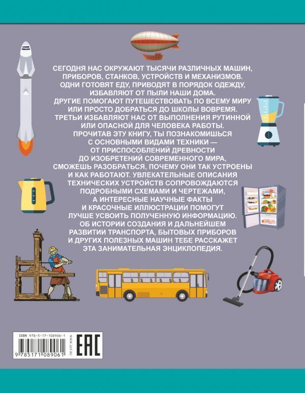 Эта энциклопедия заинтересует всех ребят без исключения. Ведь она содержит исчерпывающую информацию об история появления и использования человеком самых разных машин и механизмов. Своим существованием они заметно облегчили и во многом изменили нашу жизнь. Познакомиться с наиболее распространенными видами технических устройств, разобраться в их работе вам помогут увлекательные описания, которые сопровождаются подробными схемами и чертежами. А занимательные факты из области науки и техники и многочисленные иллюстрации помогут лучше усвоить информацию.Характеристики