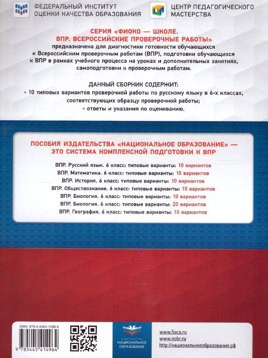 В сборнике представлены: 10 типовых вариантов проверочной работы по русскому языку в 6-х классах, составленных в соответствии с образцом проверочной работы; инструкция по выполнению работы; ответы и указания по оцениванию; карта индивидуальных достижений, фиксирующая результаты выполнения всех вариантов проверочной работы. Выполнение типовых вариантов предоставляет обучающимся возможность самостоятельно подготовиться к Всероссийским проверочным работам и объективно оценить уровень своей подготовки. Учителя могут использовать издания серии для организации контроля результатов освоения школьниками образовательных программ основного общего образования и интенсивной подготовки обучающихся к Всероссийским проверочным работам. Рекомендуем!Характеристики