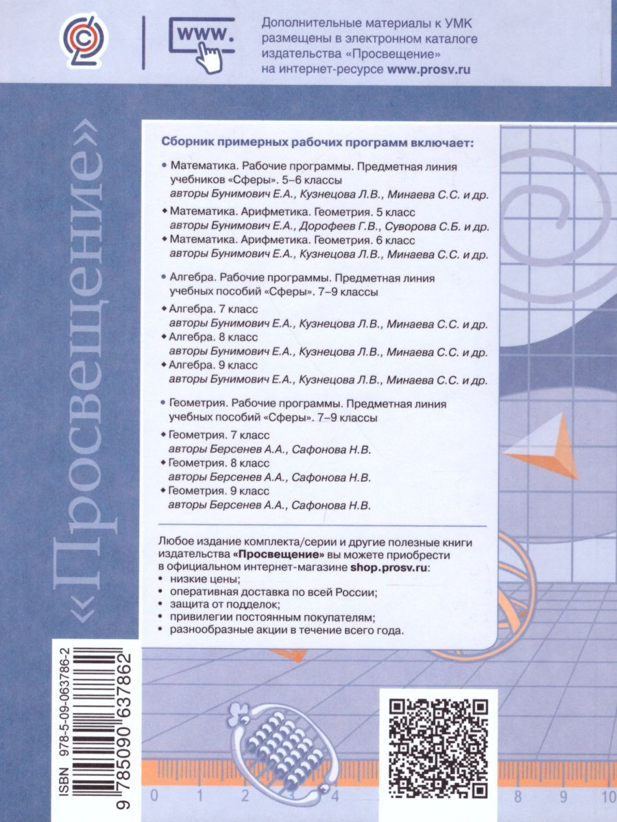 Сборник примерных рабочих программ по математике включает: примерные рабочие программы предметной линии учебников «Сферы» по математике для 5-6 классов (авт. Бунимович Е.А и др), примерные рабочие программы предметной линии учебных пособий «Сферы» по алгебре для 7-9 классов (авт. Бунимович Е.А и др), примерные рабочие программы предметной линии учебных пособий «Сферы» по геометрии для 7–9 классов (авт. Сафонова Н.В.). Программы соответствуют требованиям ФГОС к структуре программ по учебным предметам основной образовательной программы основного общего образования. Рабочие программы содержат пояснительную записку, общую характеристику учебного предмета, описание места в учебном плане, личностные, метапредметные и предметные результаты освоения предмета, содержание курса, тематическое планирование с характеристикой основных видов учебной деятельности на уроках и перечнем УМК ресурсов для каждого урока.Характеристики