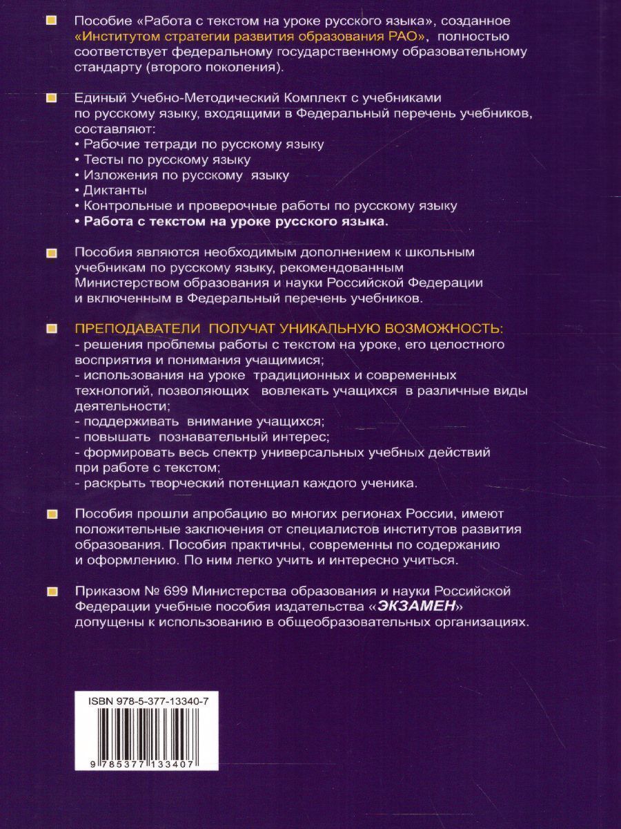 Данное пособие полностью соответствует федеральному государственному образовательному стандарту (второго поколения). Одна из важнейших проблем современной методики преподавания русского языка - поиск возможностей решения проблемы работы с текстом на уроке, его целостного восприятия и понимания. Пособие содержит описание возможностей использования традиционных и современных технологий, позволяющих вовлекать учащихся в различные виды деятельности; поддерживать внимание обучающихся, повышать познавательный интерес, формировать весь спектр универсальных учебных действий учащихся при организации работы с текстом.Характеристики