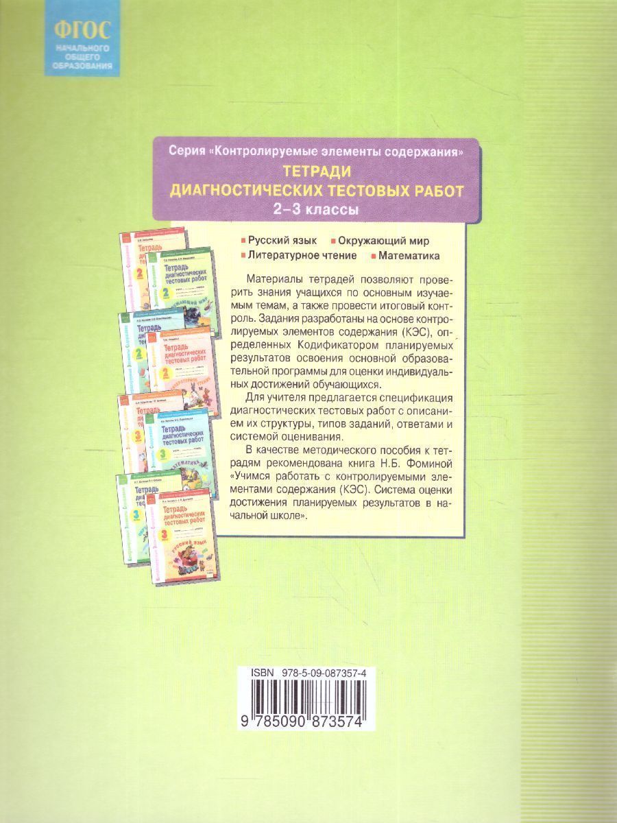 Тетрадь предназначена для диагностики уровня имеющихся у учащихся знаний и умений для успешного обучения во 2 классе. Диагностические работы представлены в двух вариантах по трем основным предметам: русскому языку, математике и окружающему миру. Работы состоят из 5–6 заданий, которые позволяют установить, в какой мере ребенок владеет теми умениями и способами действий, которые он освоил в 1 классе (блок А), а также оценить перспективы дальнейшего изучения им учебной программы (блок Б).В конце тетради помещены спецификации диагностических работ и краткие рекомендации по их проведению. Подробный методический комментарий, анализ предложенных заданий и систему их оценивания педагоги найдут на сайте idfedorov.ru. Диагностика проводится в первые недели сентября, является универсальной и может использоваться при работе с любыми учебно-методическими комплектами.Характеристики