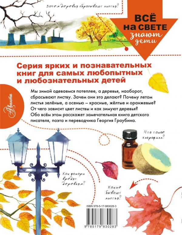 Мы зимой одеваемся потеплее, а деревья, наоборот, сбрасывают листву. Зачем они это делают? Почему летом листья зелёные, а осенью – красные, жёлтые и оранжевые? От чего зависит цвет листвы и как деревья зимуют? Обо всём этом расскажет замечательная книга детского писателя, поэта и переводчика Георгия Граубина "Почему желтеют листья?" Для младшего школьного возраста.Характеристики