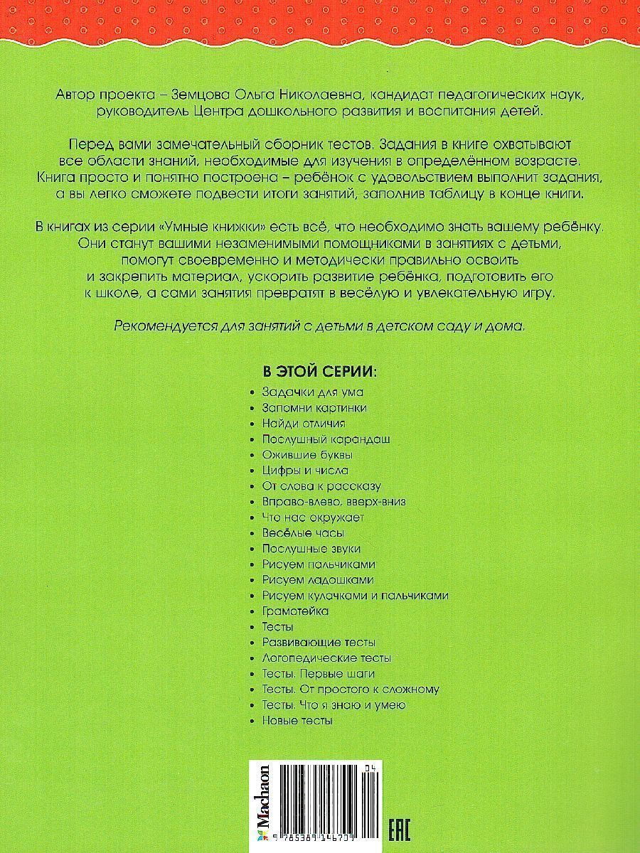 Автор проекта — Земцова Ольга Николаевна, кандидат педагогических наук, руководитель Центра дошкольного развития и воспитания детей. Перед вами замечательный сборник тестов. Задания в книге охватывают все области знаний, необходимые для изучения в определённом возрасте. Книга просто и понятно построена — ребёнок с удовольствием выполнит задания, а вы легко сможете подвести итоги занятий, заполнив таблицу в конце книги. В книгах из серии "Умные книжки" есть всё, что необходимо знать вашему ребёнку. Они станут вашими незаменимыми помощниками в занятиях с детьми, помогут своевременно и методически правильно освоить и закрепить материал, ускорить развитие ребёнка, подготовить его к школе, а сами занятия превратят в весёлую и увлекательную игру. Рекомендуется для занятий с детьми в детском саду и дома.Характеристики