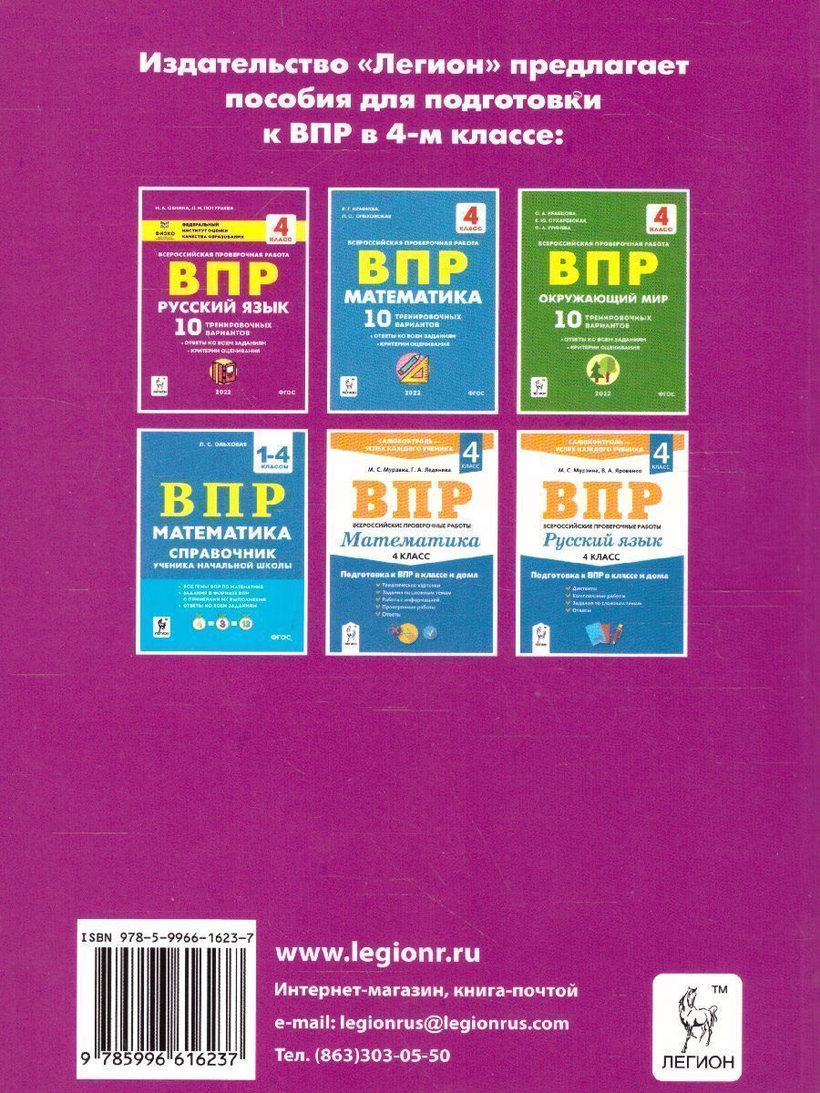 Пособие предназначено для подготовки к всероссийским проверочным работам в 4 классе. Работа с книгой поможет написать ВПР на высокий балл. Пособие содержит: 15 вариантов в формате ВПР: по каждому предмету предлагаются 5 вариантов; инструкции для школьников; методические рекомендации учителям; ответы ко всем заданиям и критерии их оценивания. Задания соответствуют спецификациям и демоверсиям проверочных работ, приведённым на официальном сайте. Все варианты единообразно структурированы и имеют одинаковый уровень сложности. Пособие адресовано выпускникам начальной школы, учителям и родителям.Характеристики