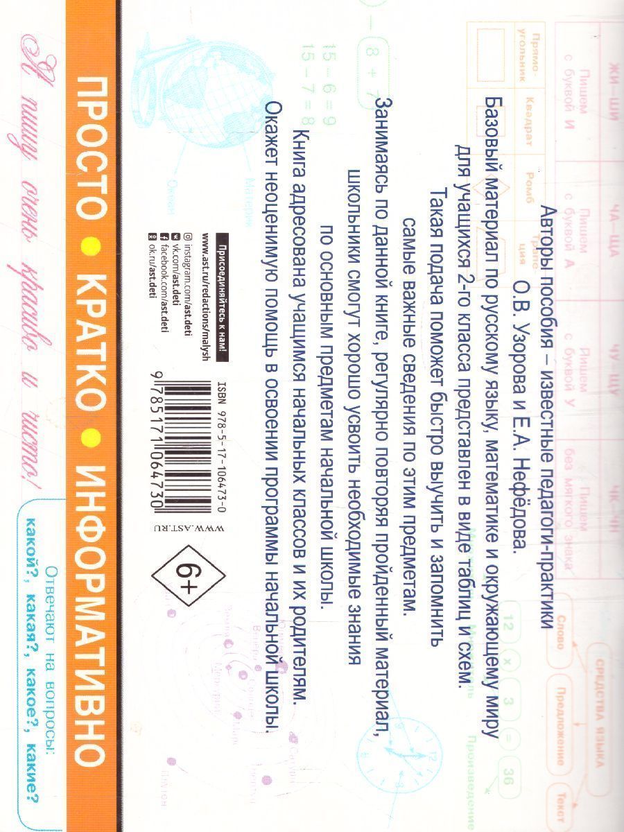 О чем эта книгаУчебное пособие известных педагогов-практиков О. В. Узоровой и Е. А. Нефёдовой включает схемы и таблицы по русскому языку, математике и окружающему миру. Такая подача материала поможет школьникам быстро выучить и запомнить самые важные сведения по этим предметам. Кому эта книга будет интереснаШкольникам начальных классов и их родителям. Каковы особенности этой книги• Весь материал представлен в виде таблиц и схем.• Регулярные повторения пройденного материала помогут школьнику усвоить необходимые знания по основным предметам. Книга адресована учащимся начальных классов и окажет неоценимую помощь в освоении программы начальной школы. Рекомендуем!Характеристики