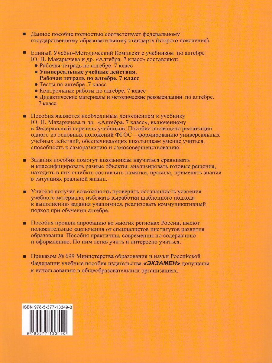 Данное пособие полностью соответствует федеральному государственному образовательному стандарту (второго поколения). Авторами предложены разнообразные упражнения по всем темам, изложенным в учебнике, способствующие формированию у учащихся универсальных учебных действий (УУД): поиск и выделение необходимой информации, осознанное и произвольное построение речевого высказывания в устной и письменной форме; анализ, синтез, выбор оснований и критериев для сравнения, анализ истинности утверждений, доказательство, самостоятельное создание способов решения проблем творческого и поискового характера, планирование учебного сотрудничества со сверстниками. В соответствии с функциями в УУД выделены четыре группы: 1) личностные, 2) познавательные, 3) регулятивные, 4) коммуникативные. Согласно Федеральному государственному образовательному стандарту формирование УУД должно являться целью обучения и создаваться при освоении учениками каждой предметной области с учетом ее специфики. Рабочая тетрадь насыщена задачами, предполагающими привлечения для их решения информации, поиск которой посилен ученикам 7 класса. Увлекательные задачи затрагивают широкий спектр знаний, содержат твердую математическую основу, требуют смекалки.Характеристики