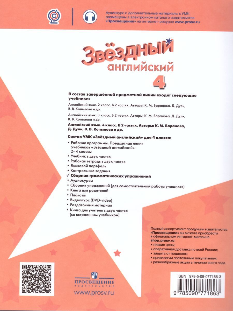 Сборник призван оказать учащимся 4 класса школы начального общего образования качественную помощь в отработке изученного грамматического материала в рамках УМК серии "Звездный английский" и достижении планируемых результатов. Пособие состоит из десяти модулей, тематически соответствующих модулям учебника, содержит краткую справку по грамматическим явлениям и разнообразные задания по трем видам речевой деятельности (письмо, чтение, говорение) на тренировку и закрепление материала. Задания построены по принципу нарастания трудностей и содержат элементы творчества: выполняя упражнения, учащиеся помогают коту Рыжику в разных игровых ситуациях. Ключи к заданиям пособия размещены на сайте издательства. Сборники могут быть использованы для самостоятельной работы учащихся, занятий в классе и индивидуальных занятий с репетиром.Характеристики