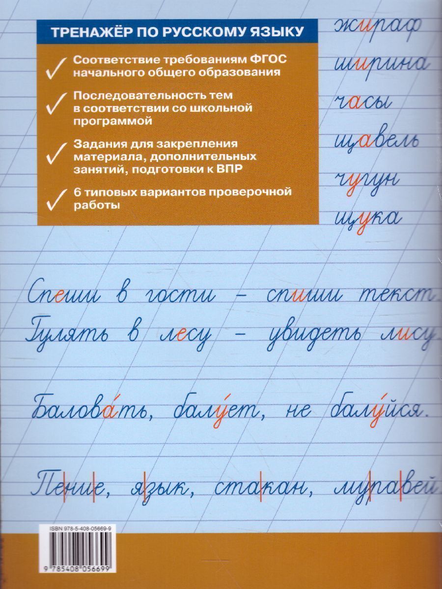 В пособии систематизирован материал, который позволит подготовить учеников к выполнению Всероссийской проверочной работы (ВПР) по русскому языку во 2 классе. Работать с тренажёром в урочное и внеурочное время ученики 1 класса могут начать в послебукварный период до начала освоения предметной области «Русский язык» и продолжить работу до конца учебного года. Пособие составлено в соответствии с требованиями ФГОС НОО. Издание предназначено для учителей, учащихся 1 класса и их родителей.Характеристики