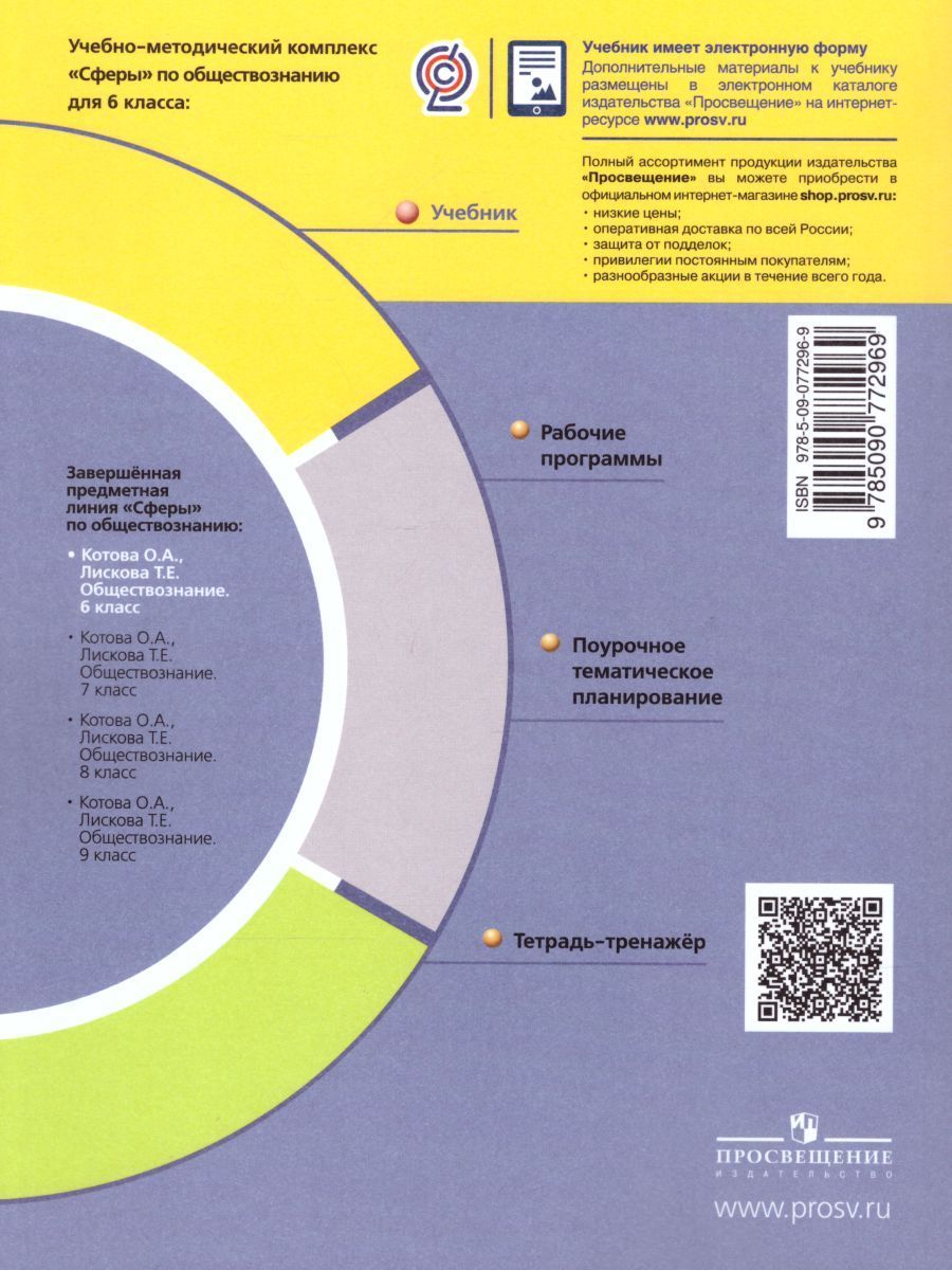 Данный учебник открывает линию учебно-методических комплексов по обществознанию "Сферы". Издание подготовлено в соответствии с требованиями Федерального государственного образовательного стандарта основного общего образования и освещает вопросы раздела курса обществознания для 6 класса. В рамках раздела учащиеся получат представление о взаимодействии людей в обществе, о сферах общественной жизни, об основных законах жизни общества и разнообразии его типов, о важнейших задачах, стоящих перед современным мировым и российским сообществом. Раздел призван способствовать формированию общегражданской российской идентичности молодых граждан России, их патриотических чувств, толерантности, социальной ответственности, правовой, духовно-нравственной и политической культуры, самостоятельности, а также приверженности ценностям, закреплённым в Конституции Российской Федерации. Авторами учебника являются сотрудники ФИПИ, отвественные за разработку контрольных измерительных материалов ГИА по обществознанию. Учебник поможет шестиклассникам успешно подготовится к ВПР по обществознанию. Соответсвует концепции преподавания курса "Обществознание" в школе.Характеристики