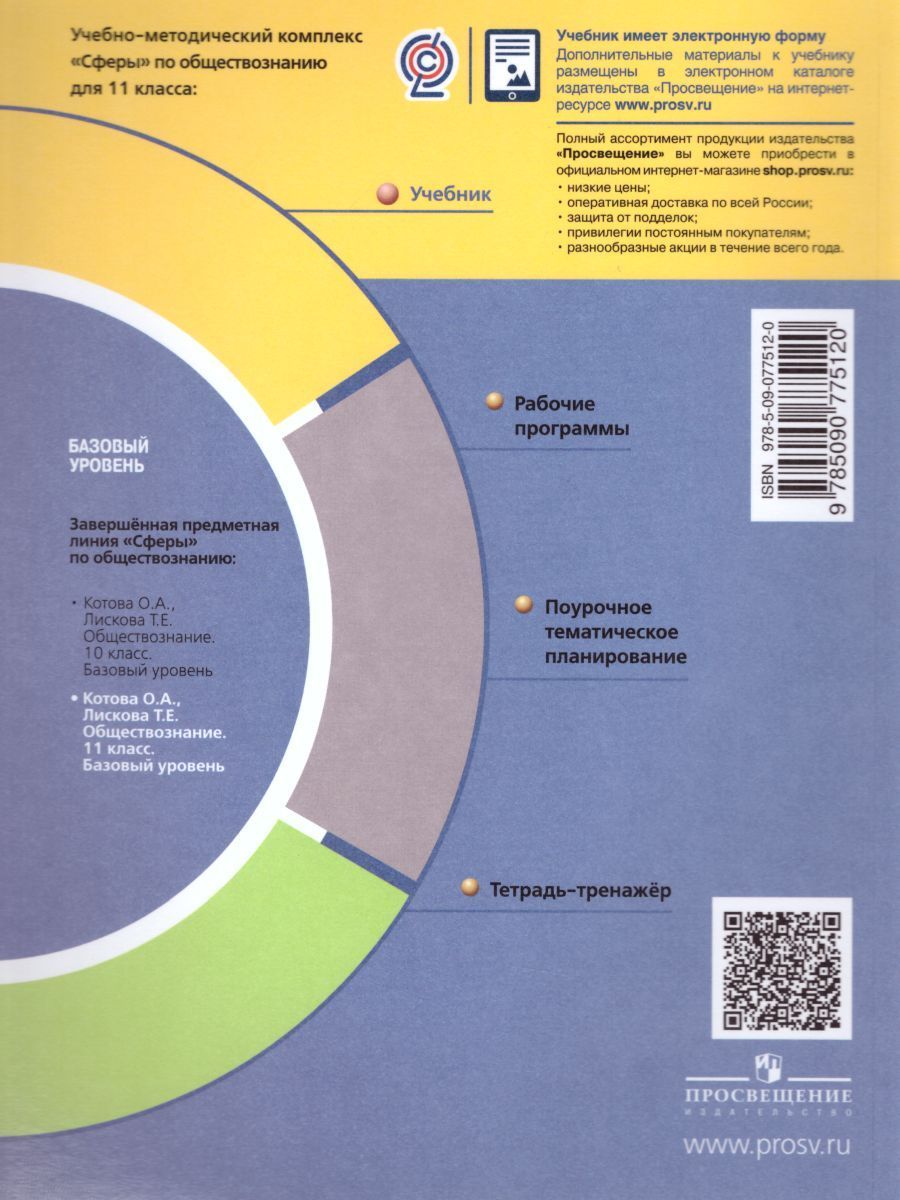 Данный учебник продолжает линию учебно-методических комплексов по обществознанию "Сферы". Издание подготовлено в соответствии с требовани- ями Федерального государственного образовательного стандарта среднего общего образования и освещает вопросы раздела курса обществознания для 11 класса. В рамках раздела курса учащиеся расширят свои познания о политико-правовой сфере общества, направлениях и проблемах его развития. Курс сохраняет преемственность оформления и подачи материала пособий основной школы, углубляет и расширяет полученные в основной школе знания и навыки; в учебных пособиях для старшей школы созданы новые сопровождающие рубрики параграфов, содержащие дополнительную информацию и задания; Наглядность, логика и особая системность подачи учебного материала призваны обеспечить успешную подготовку к сдаче Единого государственного экзамена (ЕГЭ). Авторами учебника являются сотрудники ФИПИ, отвественные за разработку контрольных измерительных материалов ГИА по обществознанию. Учебник поможет девятиклассникам успешно подготовится к ОГЭ по обществознанию. Соответсвует концепции преподавания курса "Обществознание" в школе.Характеристики